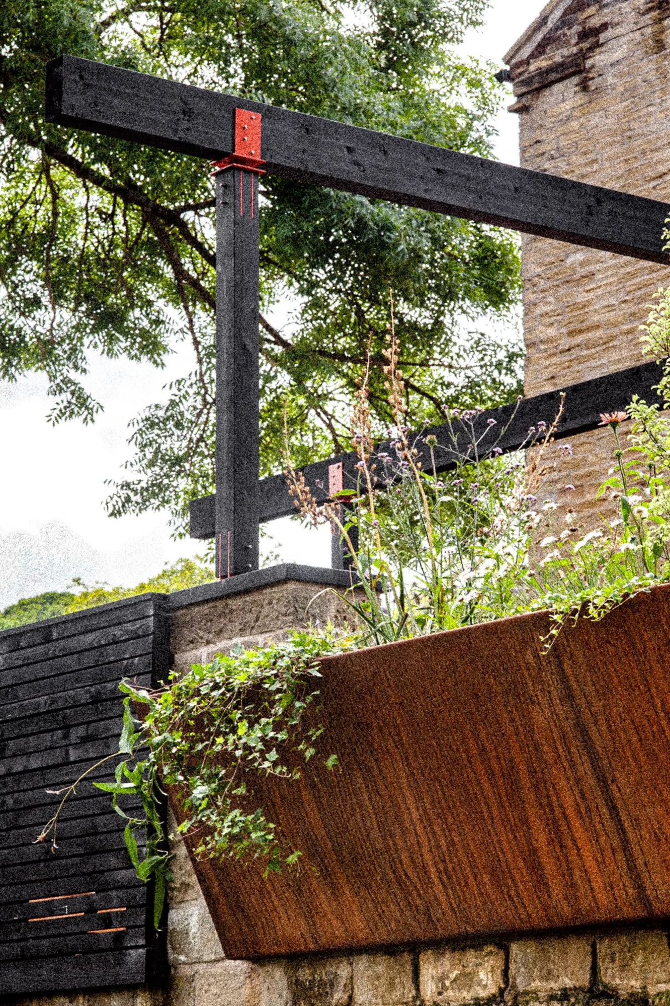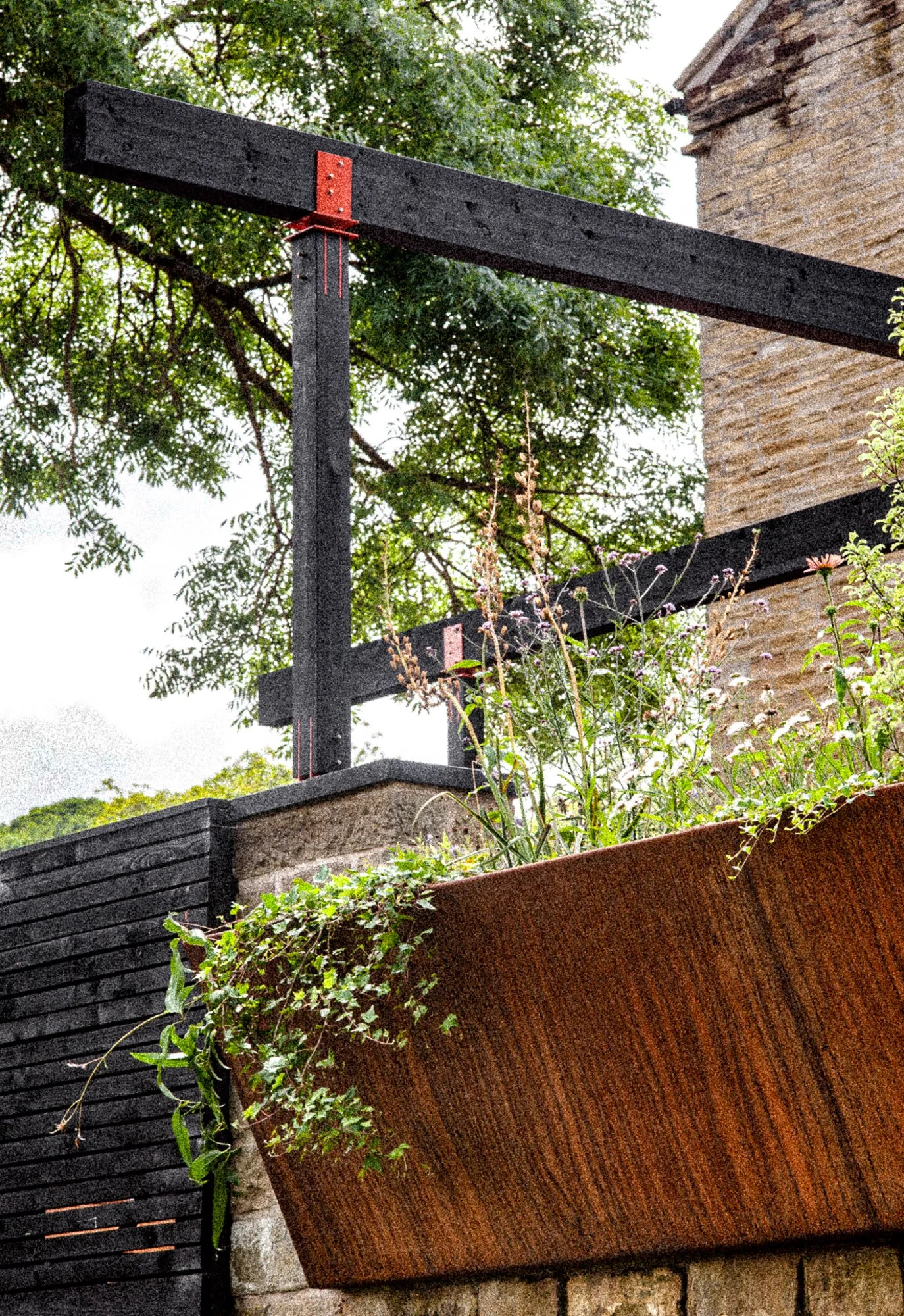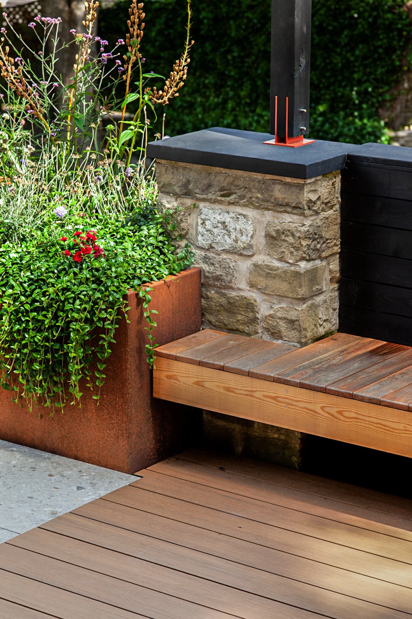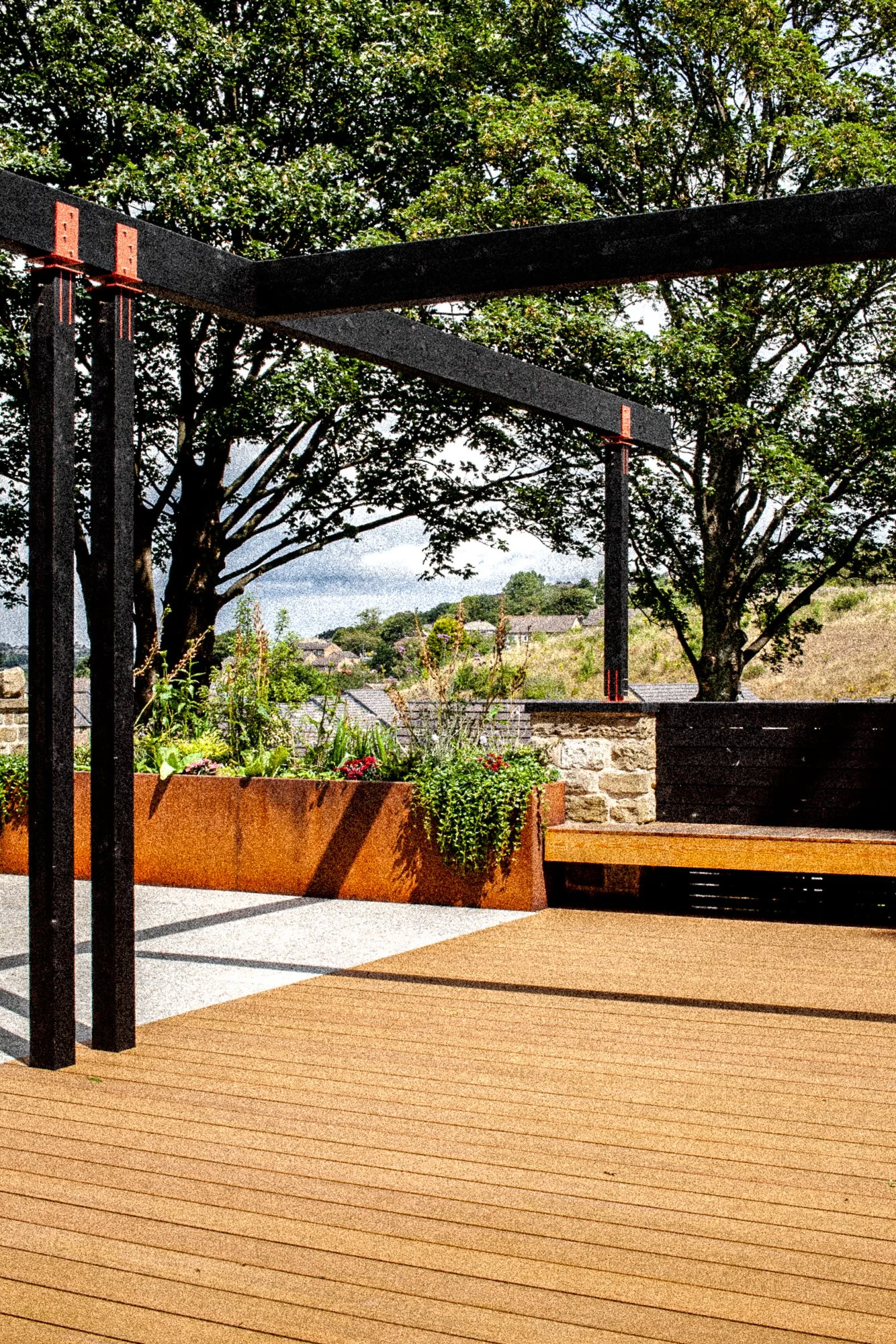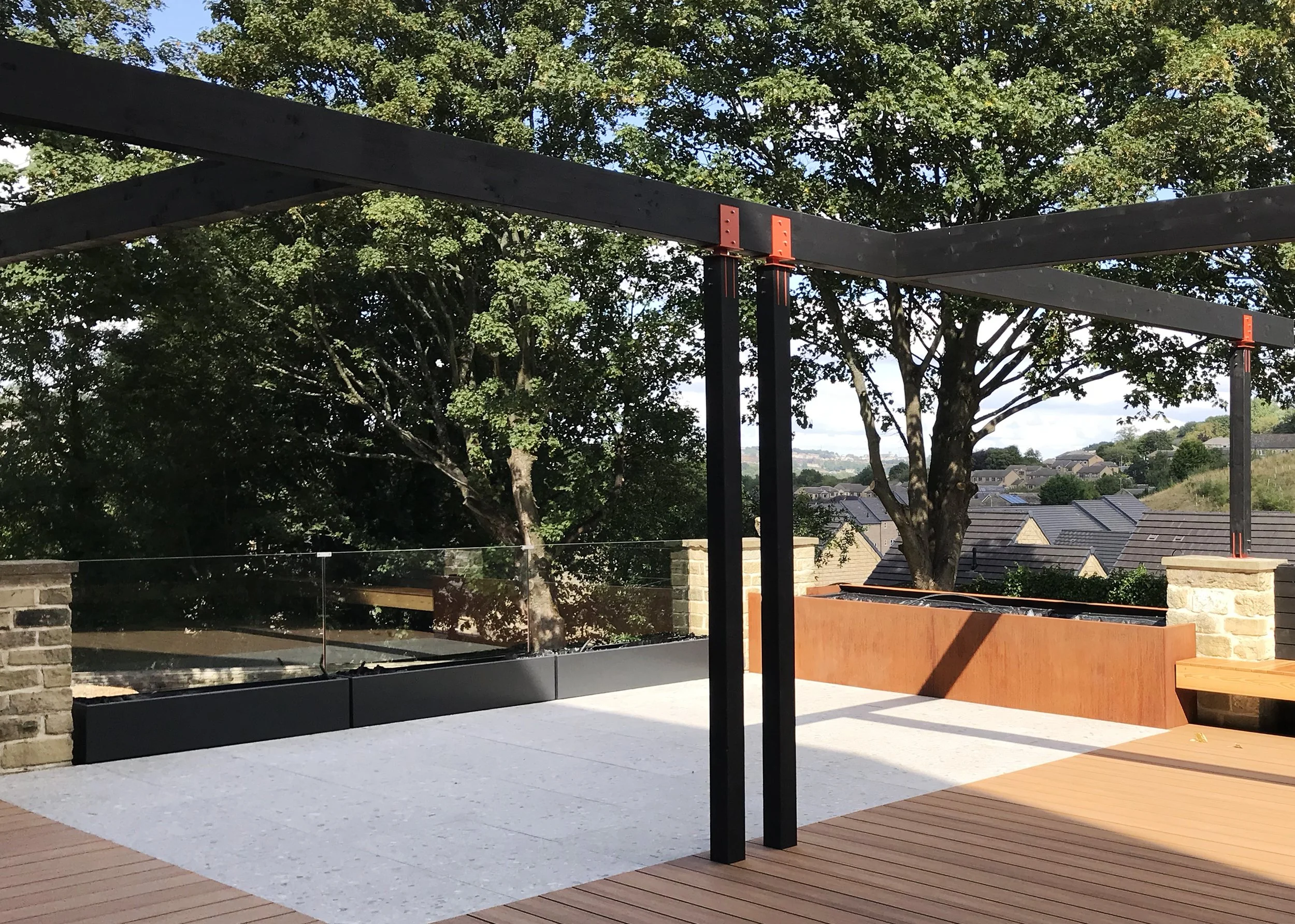 Corten and powder coated steel planters, recycled solid core wood composite decking, Italian porcelain tiles, glue laminated pergola and fencing from FSC timber, British larch bench with cherry dowels, custom made pergola and wall bracket from mild steel - galvanised and powder coated in 1970’s Vauxhall Tasman orange with stainless steel pins