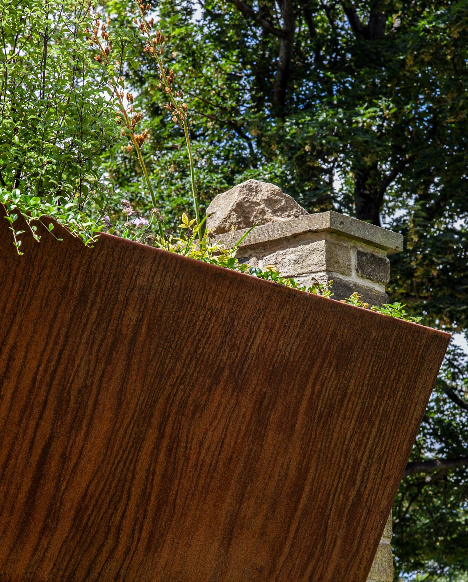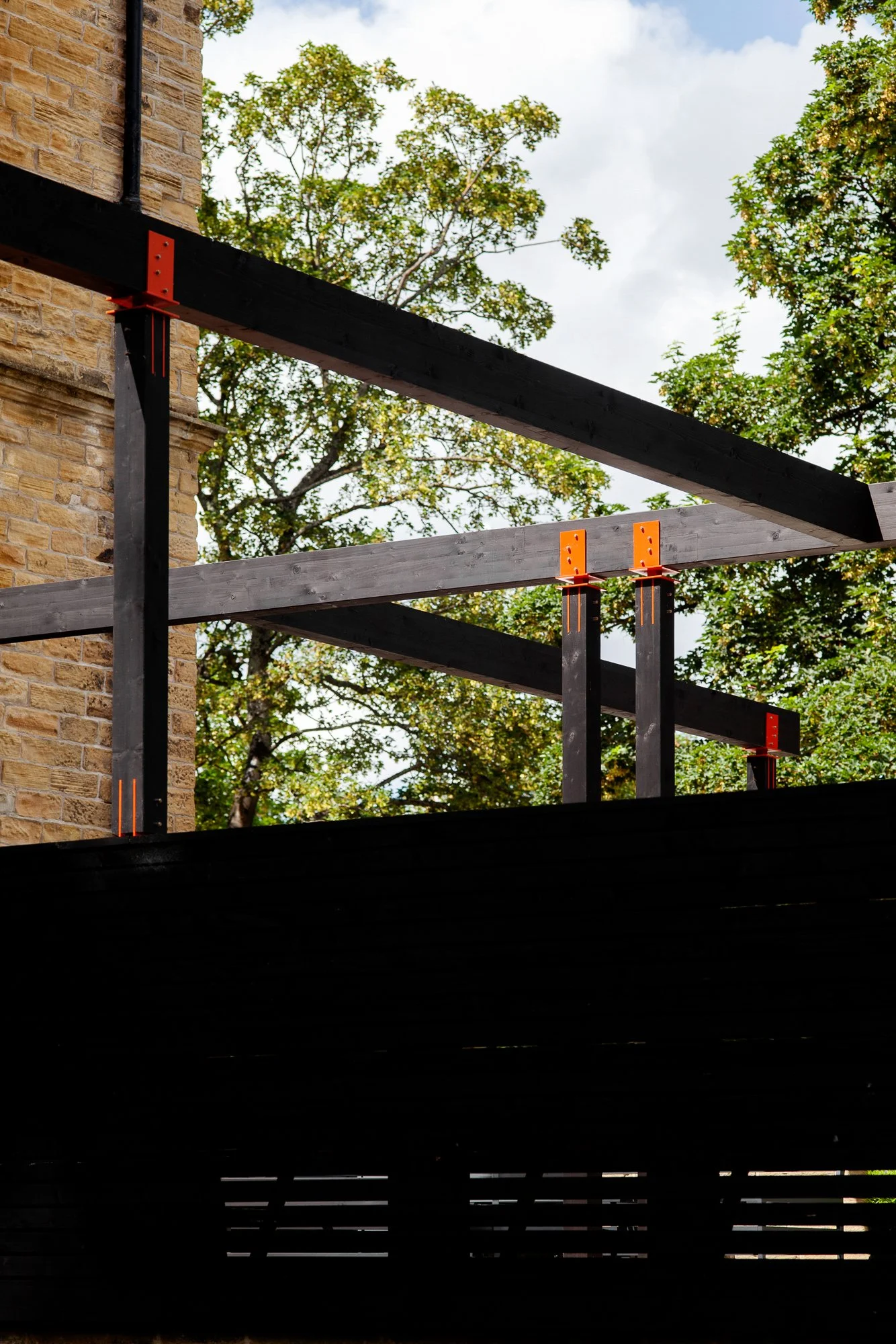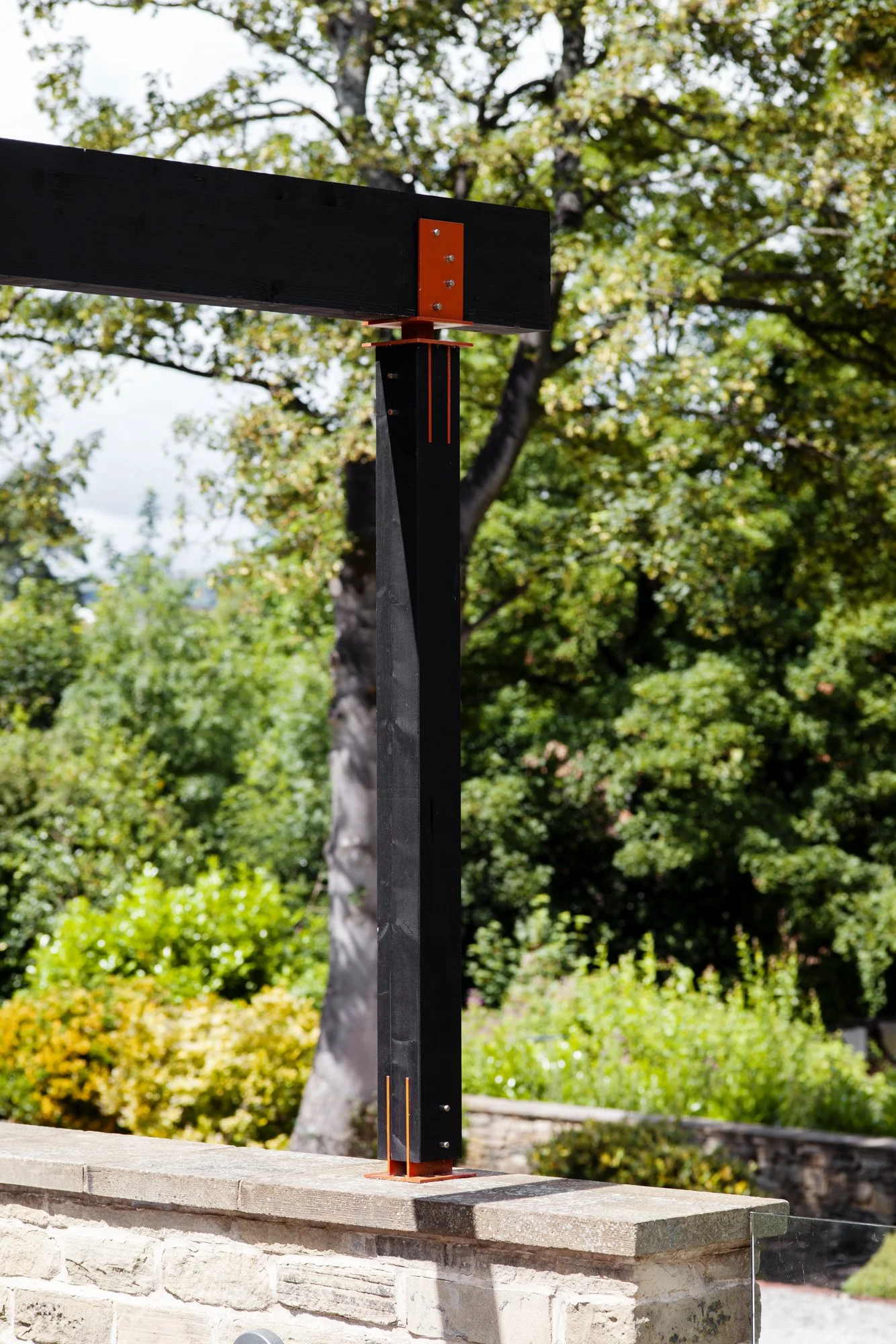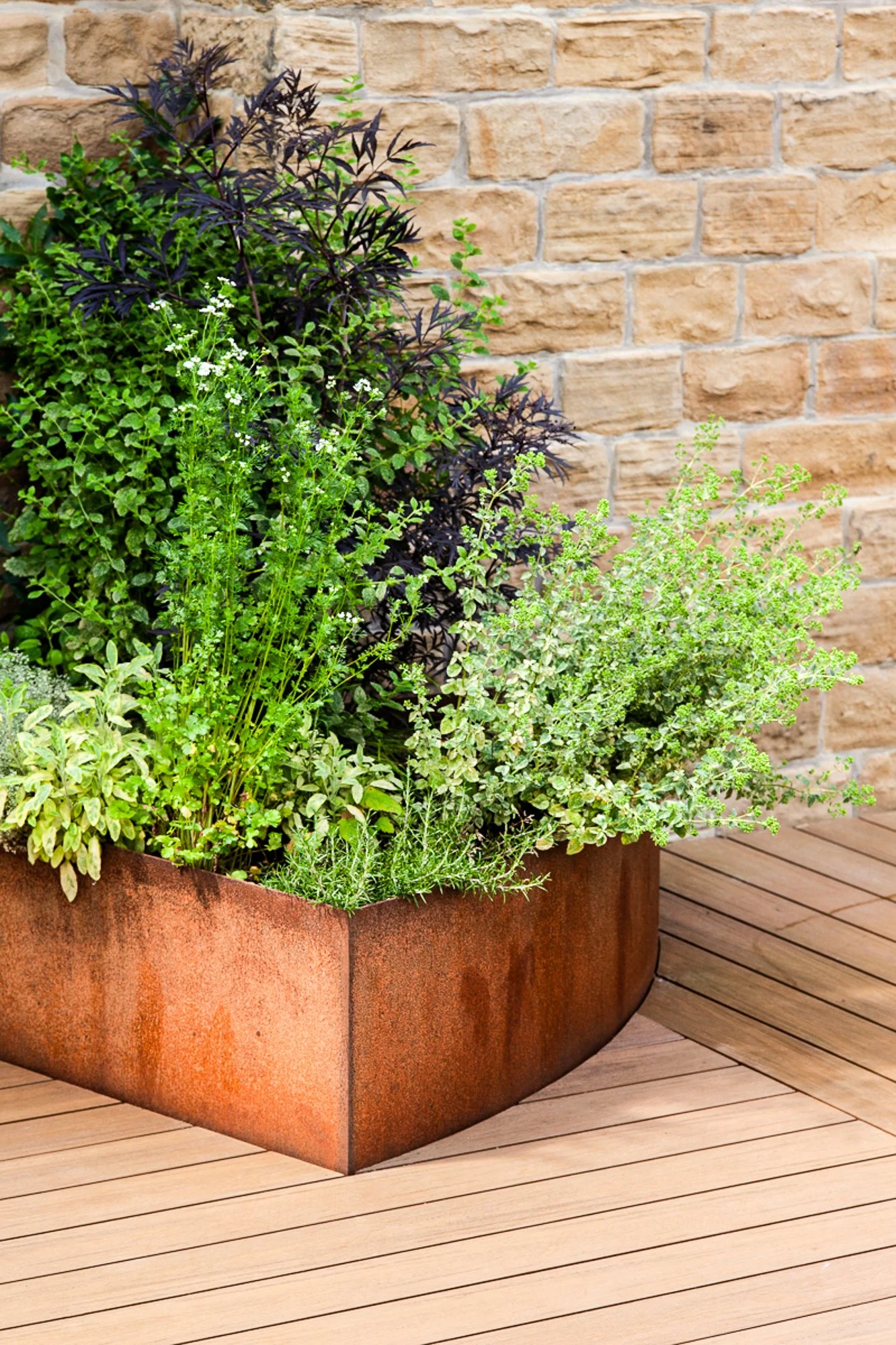 Corten and powder coated steel planters, recycled solid core wood composite decking, Italian porcelain tiles, glue laminated pergola and fencing from FSC timber, British larch bench with cherry dowels, custom made pergola and wall bracket from mild steel - galvanised and powder coated in 1970’s Vauxhall Tasman orange with stainless steel pins