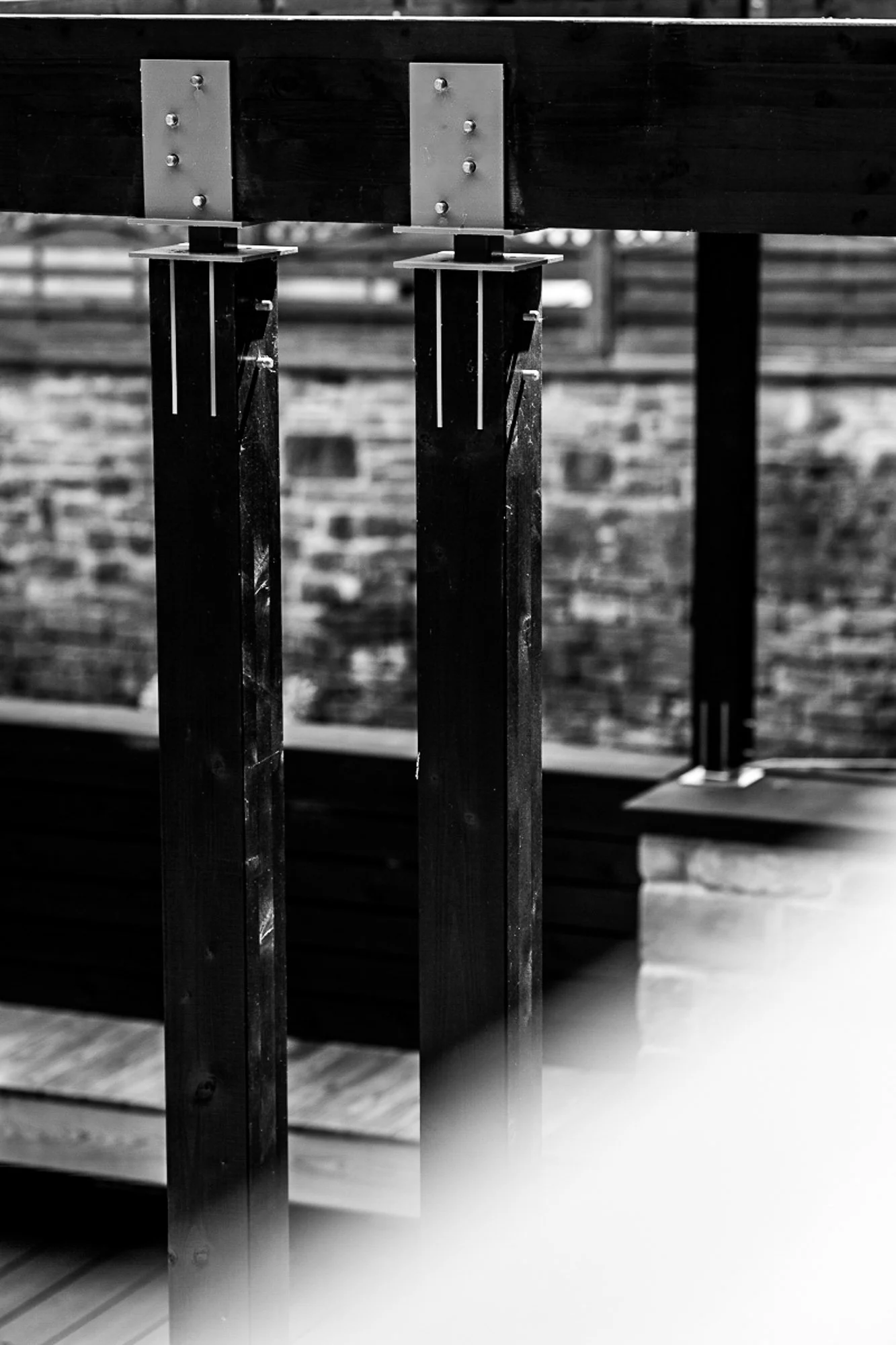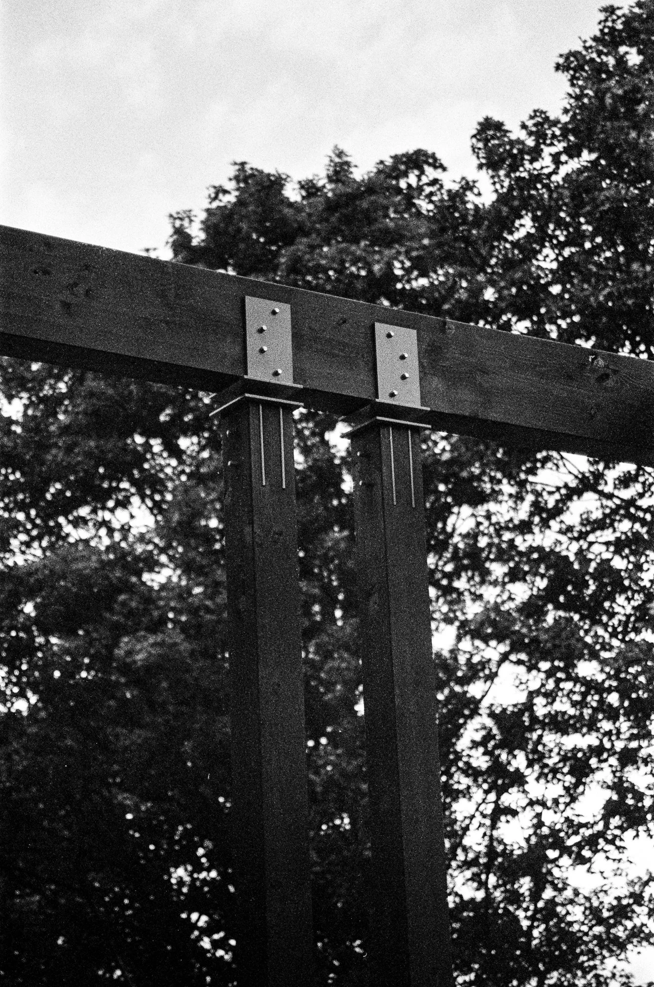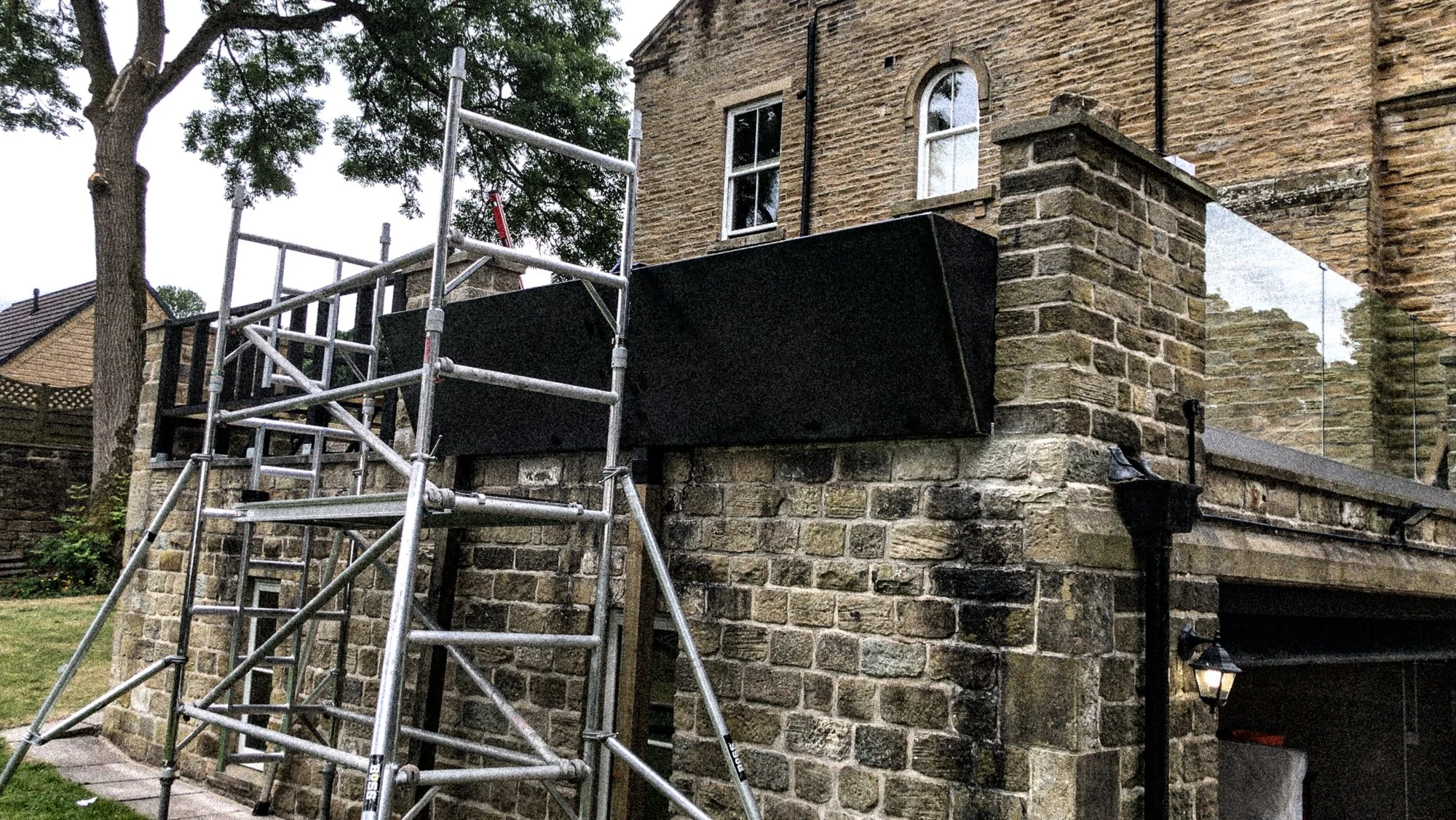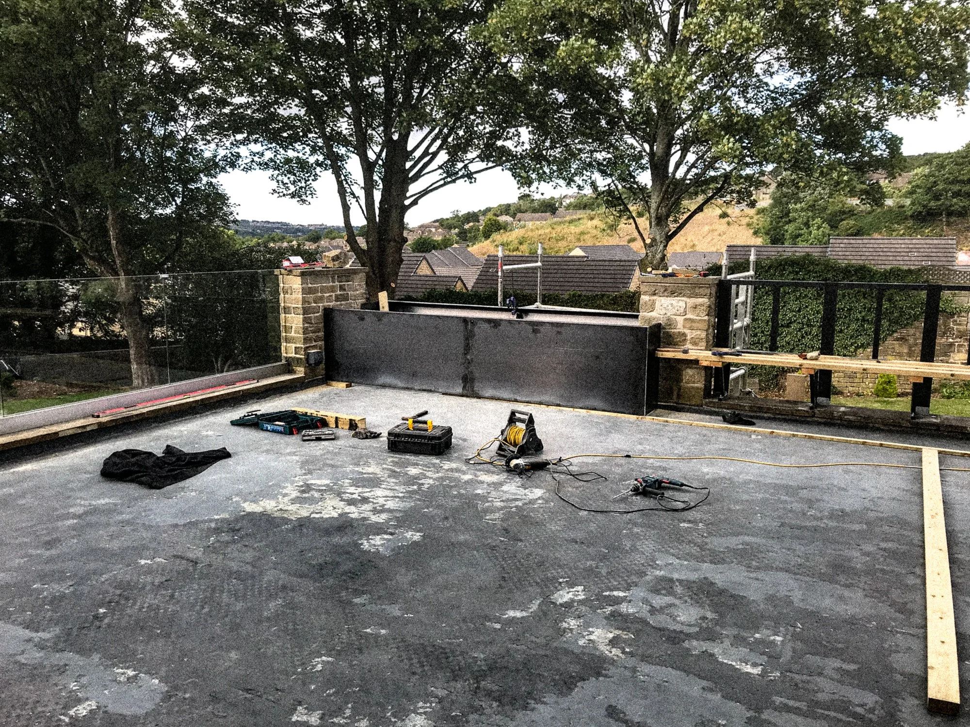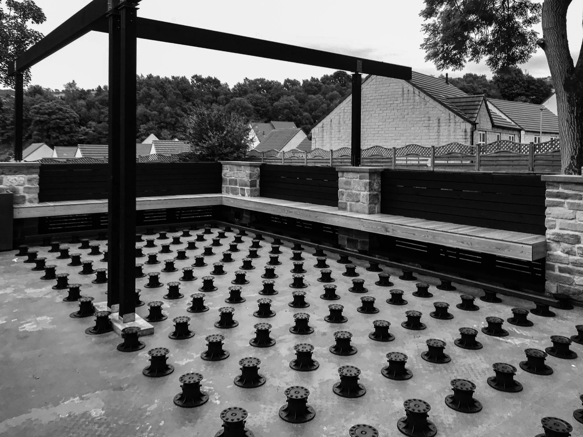 Opening out from the kitchen plain concrete pavers, artificial grass and tired composite fencing made up this large roof terrace space set atop a double garage. The client wanted an open space to entertain family and friends akin to the modern roof terrace bars of the city they enjoyed. A space that was flexible, easy to maintain and inviting with modern customised detailing was drawn up using a refined pallet of materials. The challenge was the inability to fix anything to the waterproof lining of the roof / floor itself. A floating system was devised to suspend the decking and tiles allowing the varying heights of the entranceways from house and garden to be accommodated whilst letting services run unobstructed and rain water flow to the drain out of site beneath the finished surface. A minimal pergola structure was designed which utilised the existing stone pillars allowing for seasonal appendages, string lighting, shade sails, rain covers to be attached and detached with ease. Disappointed with the range of commercially available bracketry we set about designing our own bespoke set for the client that worked with the design of the pergola structure. The challenge was to design a set of brackets that felt light against the dense timber of the pergola as if the whole structure was somewhat floating whilst being structurally strong and beautifully detailed. Bringing greenery to the space through a corten planter next to the kitchen door for growing cooking and cocktail herbs with a second cantilevered corten planter that extended the planting to the tree line beyond whilst forming a developing green boundary; all connected by a hidden Bluetooth irrigation system. A larch built in bench is finished with cherry dowel details and floats on bespoke steel brackets providing a generous and robust seating area. An inserted patio of Italian porcelain tiles designates a more formal area for outdoor sofas and a coffee table, edged with a line of powder coated low planters filled with perfumed dwarf lavenders. New black slat fencing envelopes the remaining boundaries making it safe and sheltering the area from the wind whilst allowing climbers to spread across from the plant and ground to green the space over time.
