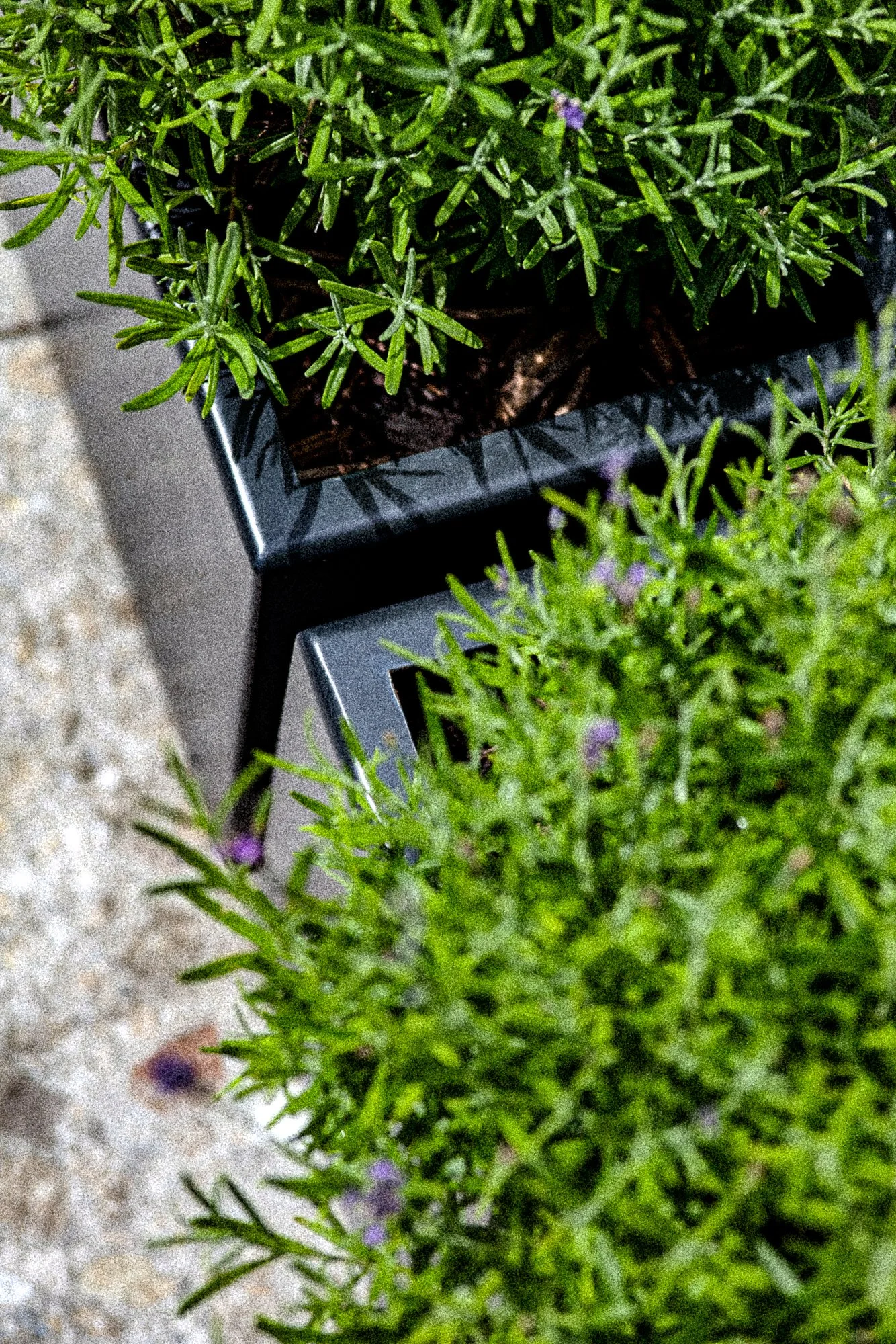 Dwarf lavender Munstead, mixed perennials and grasses with prostrate and climbing flowering evergreens and a kitchen and cocktail herb garden in a specific lightweight growing medium