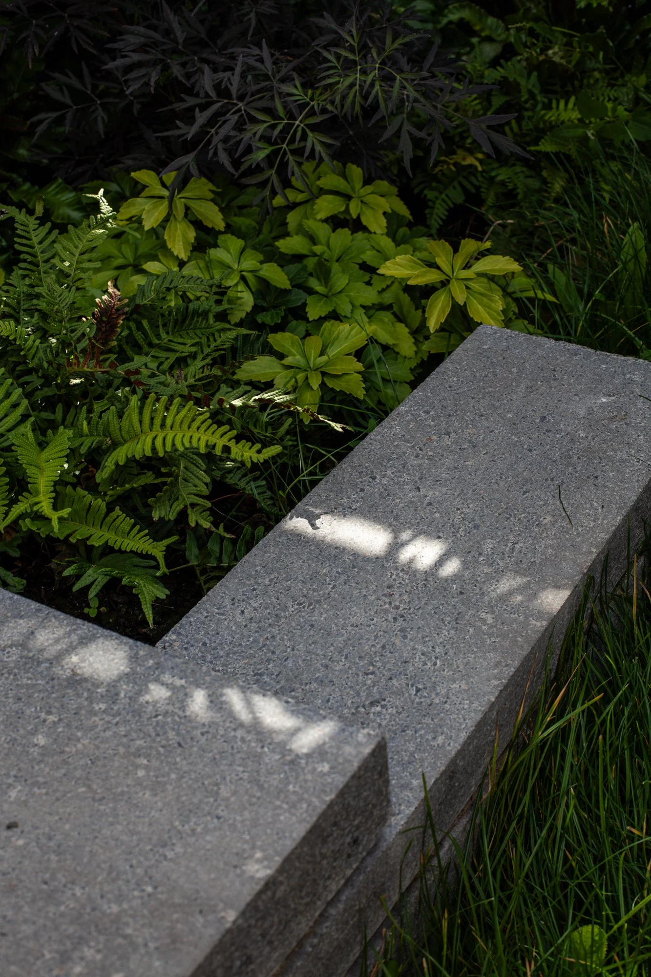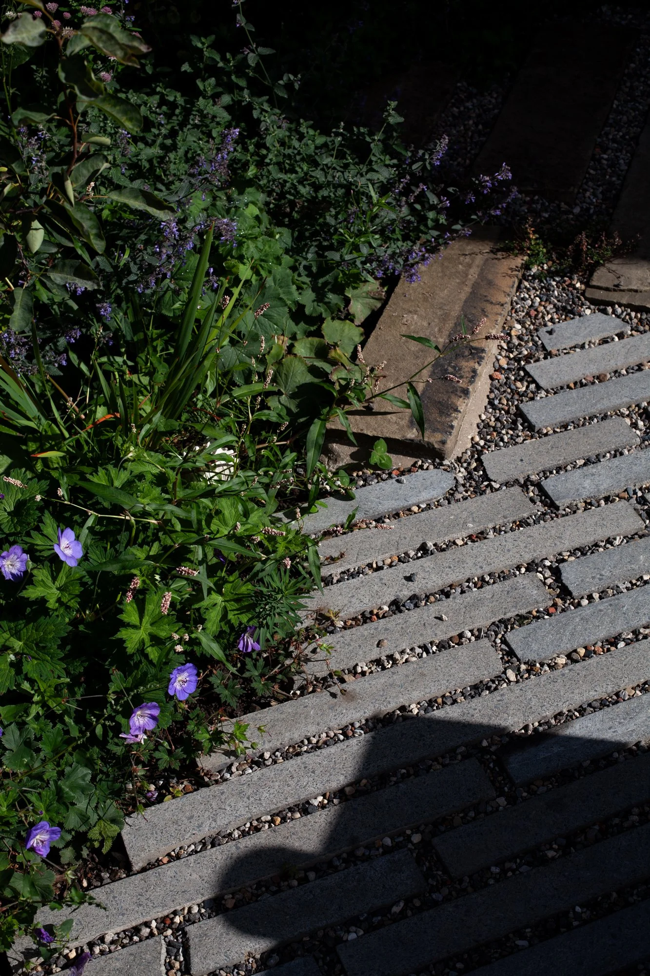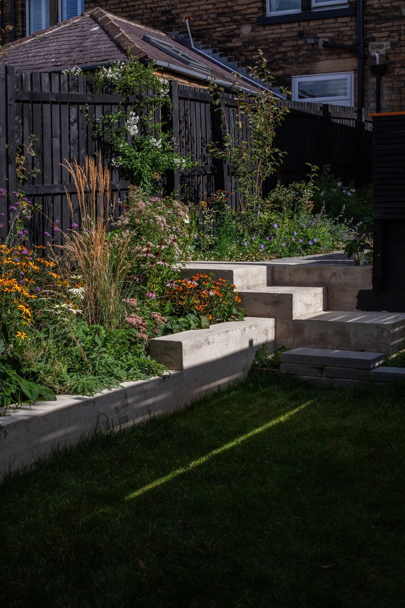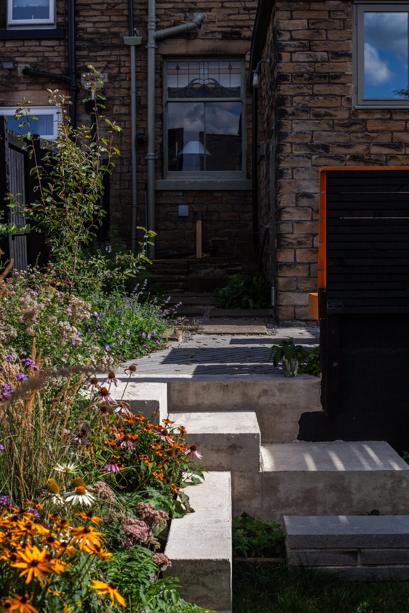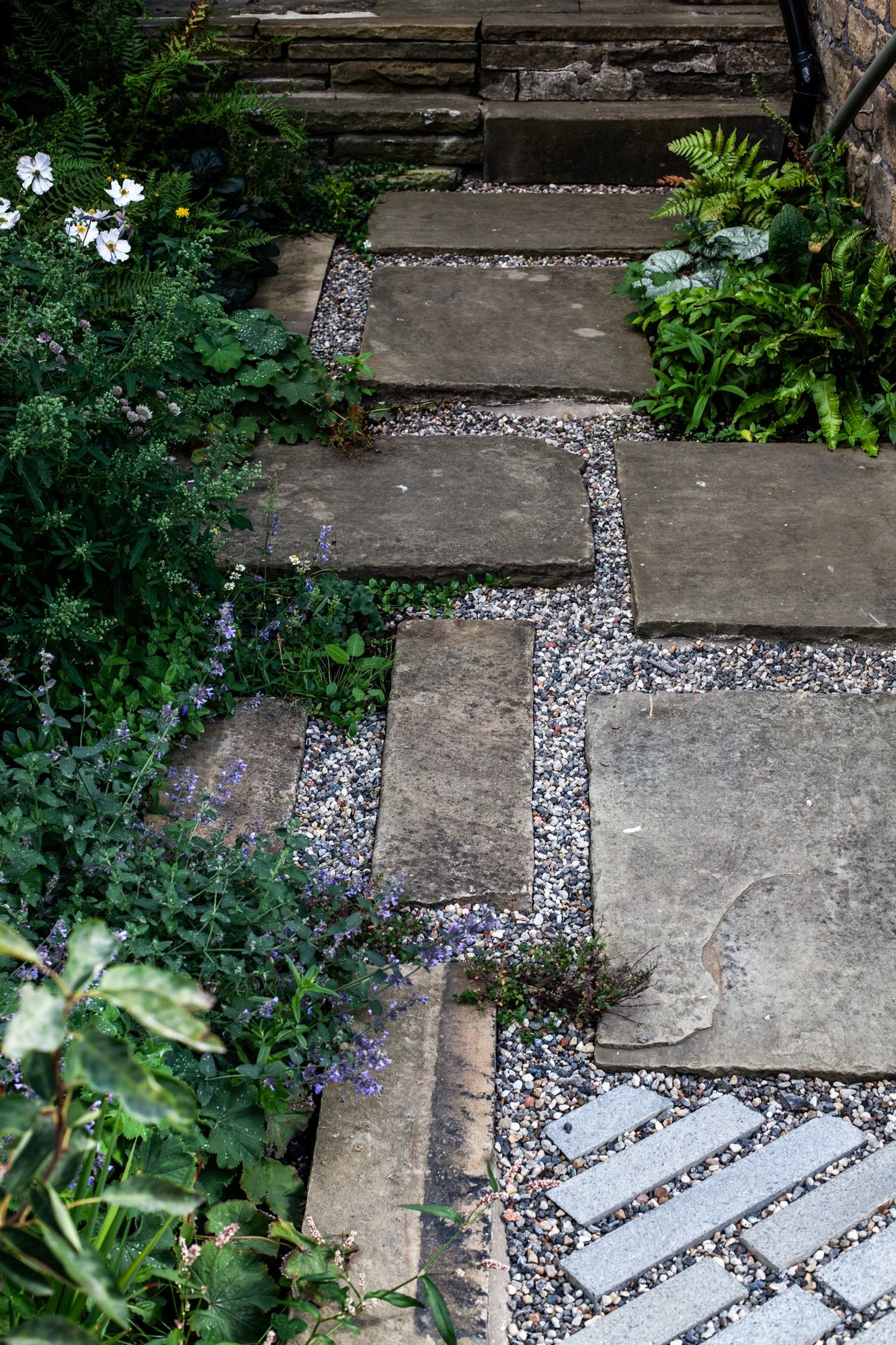 Unique slip paving and steps cut from concrete flooring slabs of previously demolished garage, custom formwork steps and retaining wall from eco-concrete, tied into old garage wall foundations and walls to prevent removal. Recycled aggregate gravels, reused existing paving cut to expose aggregate detail with recycled copper pipe weep holes for rear wall, re-orientation of yorkstone cathedral grade paving as stepping stones and widening of sandstone steps by the house and field stone boundary edging all made from stone found on site.