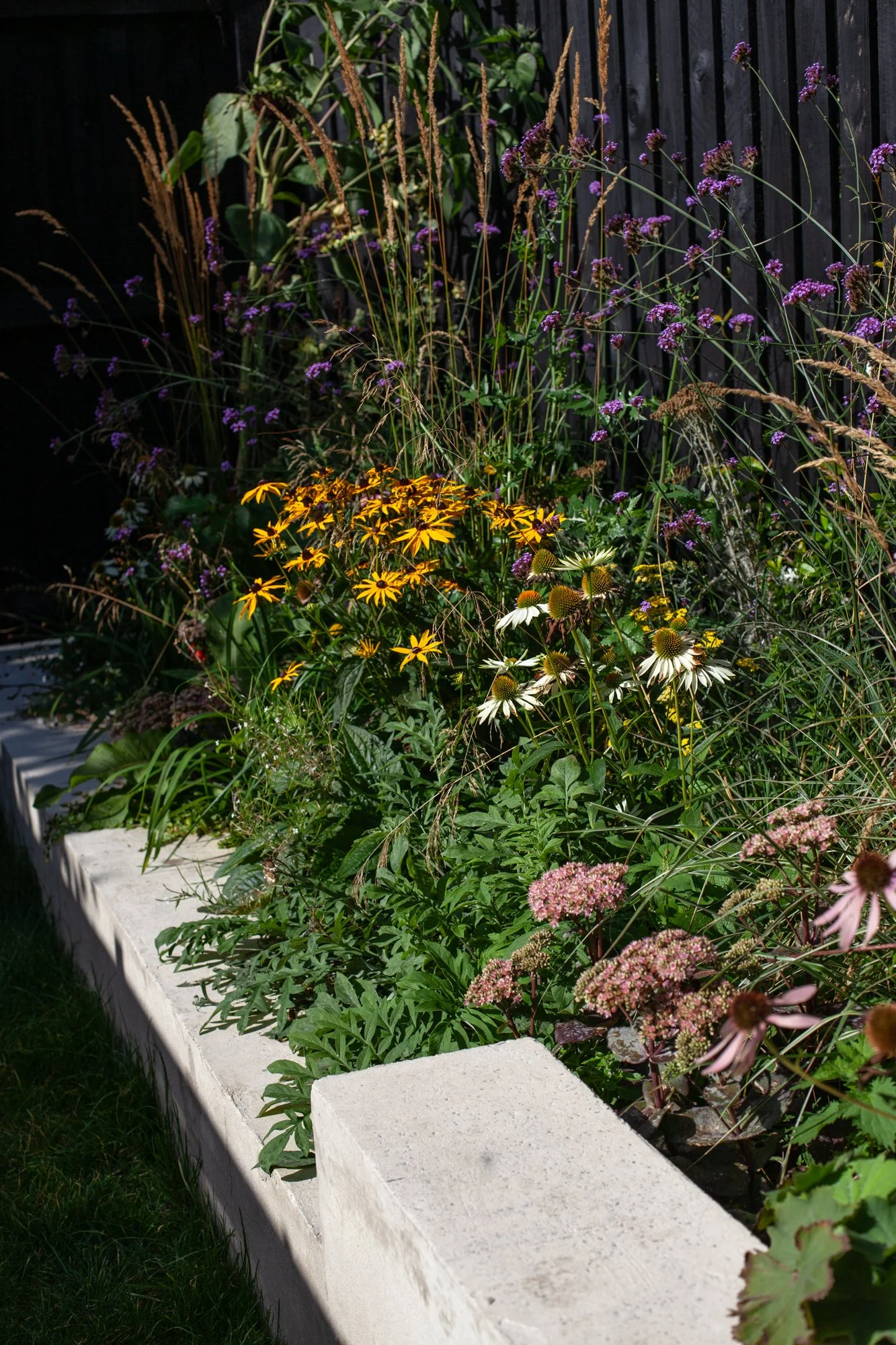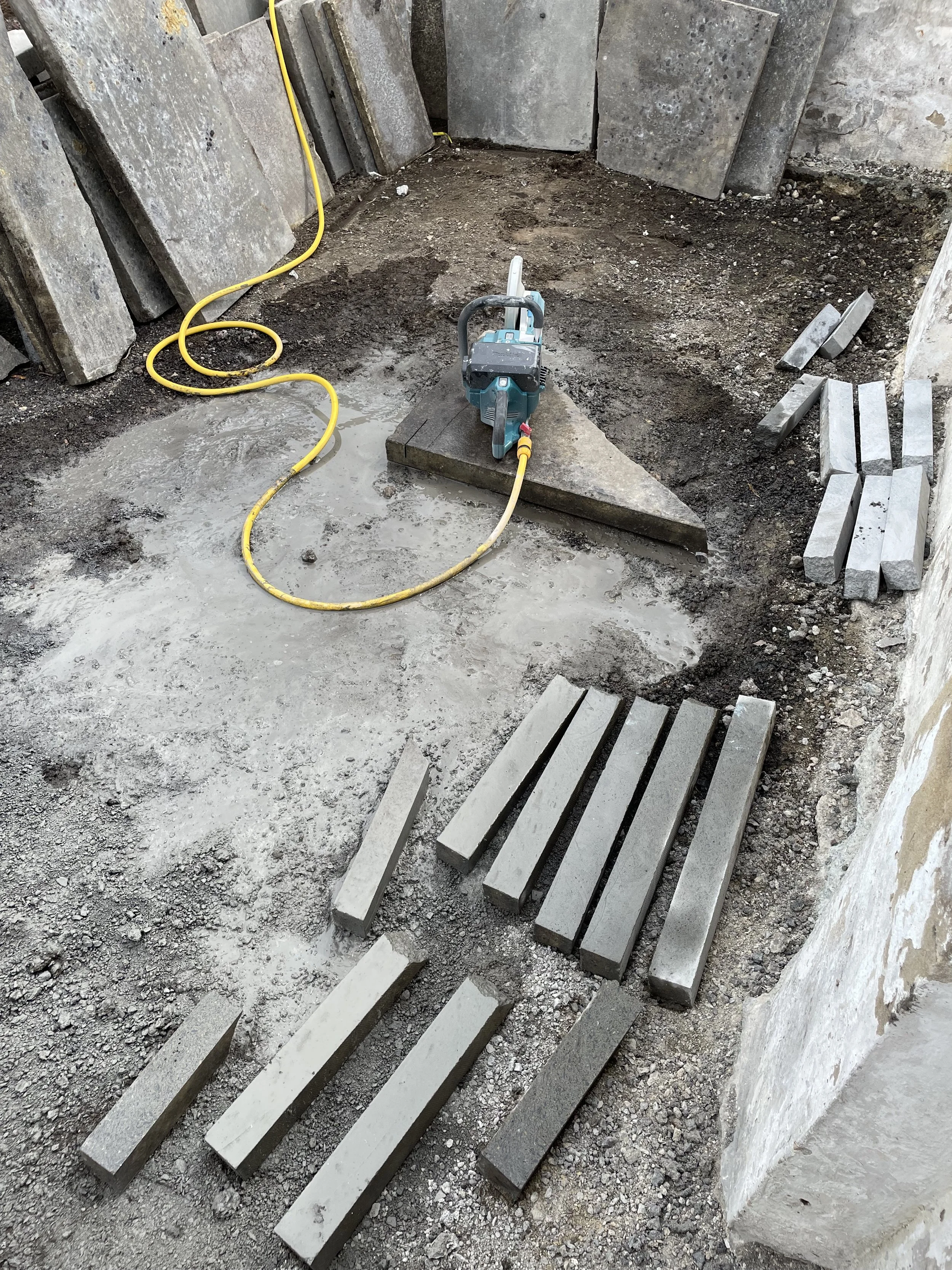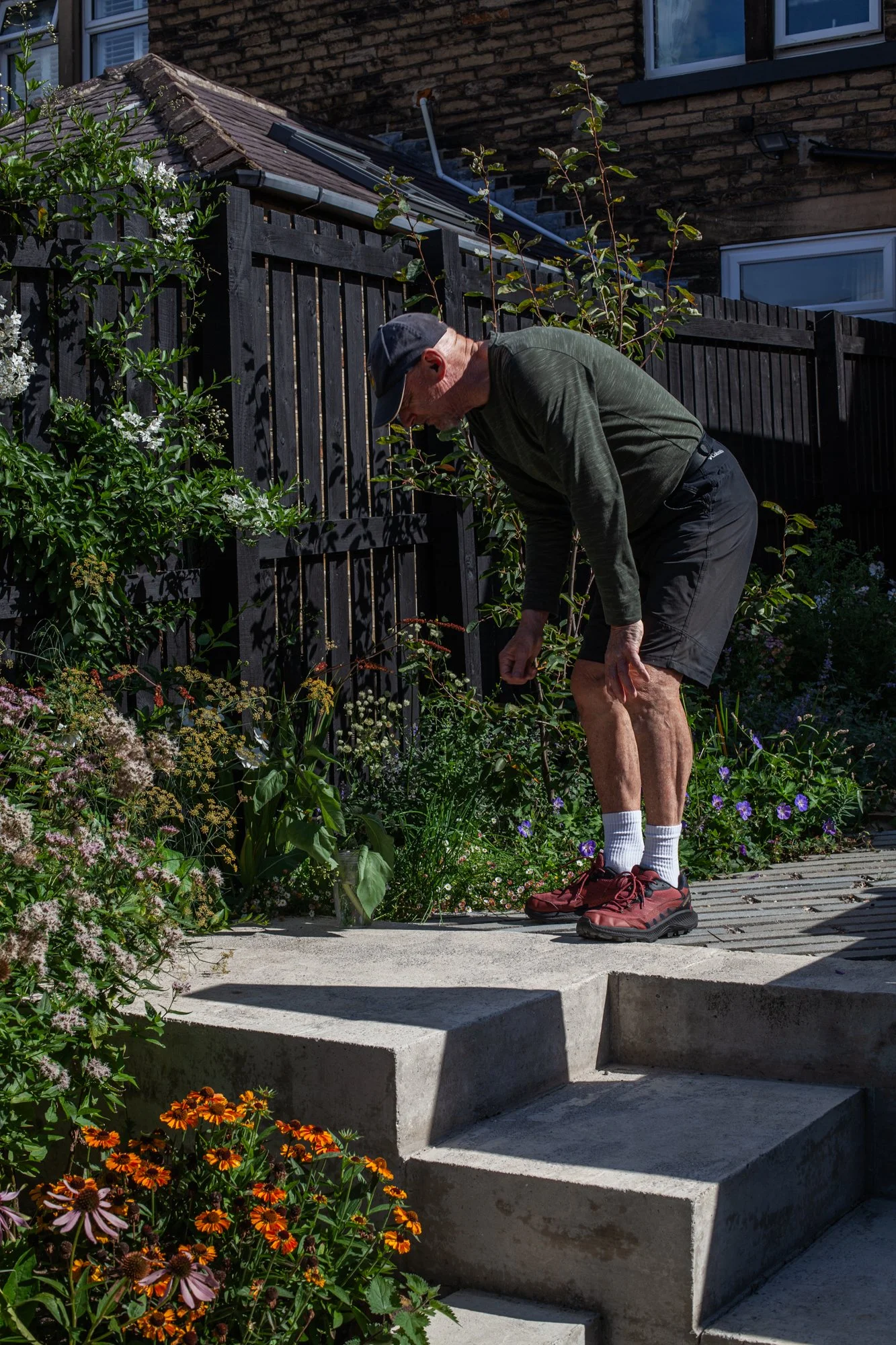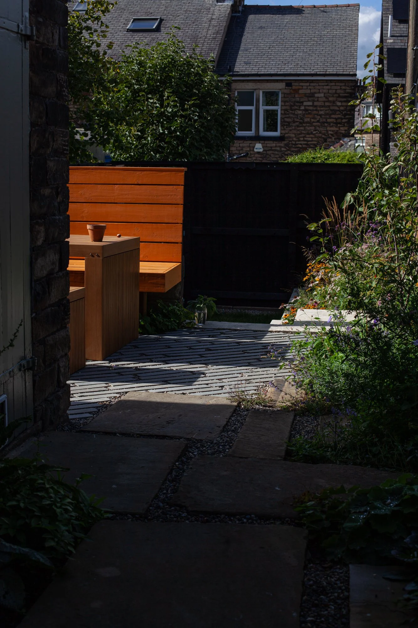 Unique slip paving and steps cut from concrete flooring slabs of previously demolished garage, custom formwork steps and retaining wall from eco-concrete, tied into old garage wall foundations and walls to prevent removal. Recycled aggregate gravels, reused existing paving cut to expose aggregate detail with recycled copper pipe weep holes for rear wall, re-orientation of yorkstone cathedral grade paving as stepping stones and widening of sandstone steps by the house and field stone boundary edging all made from stone found on site.
