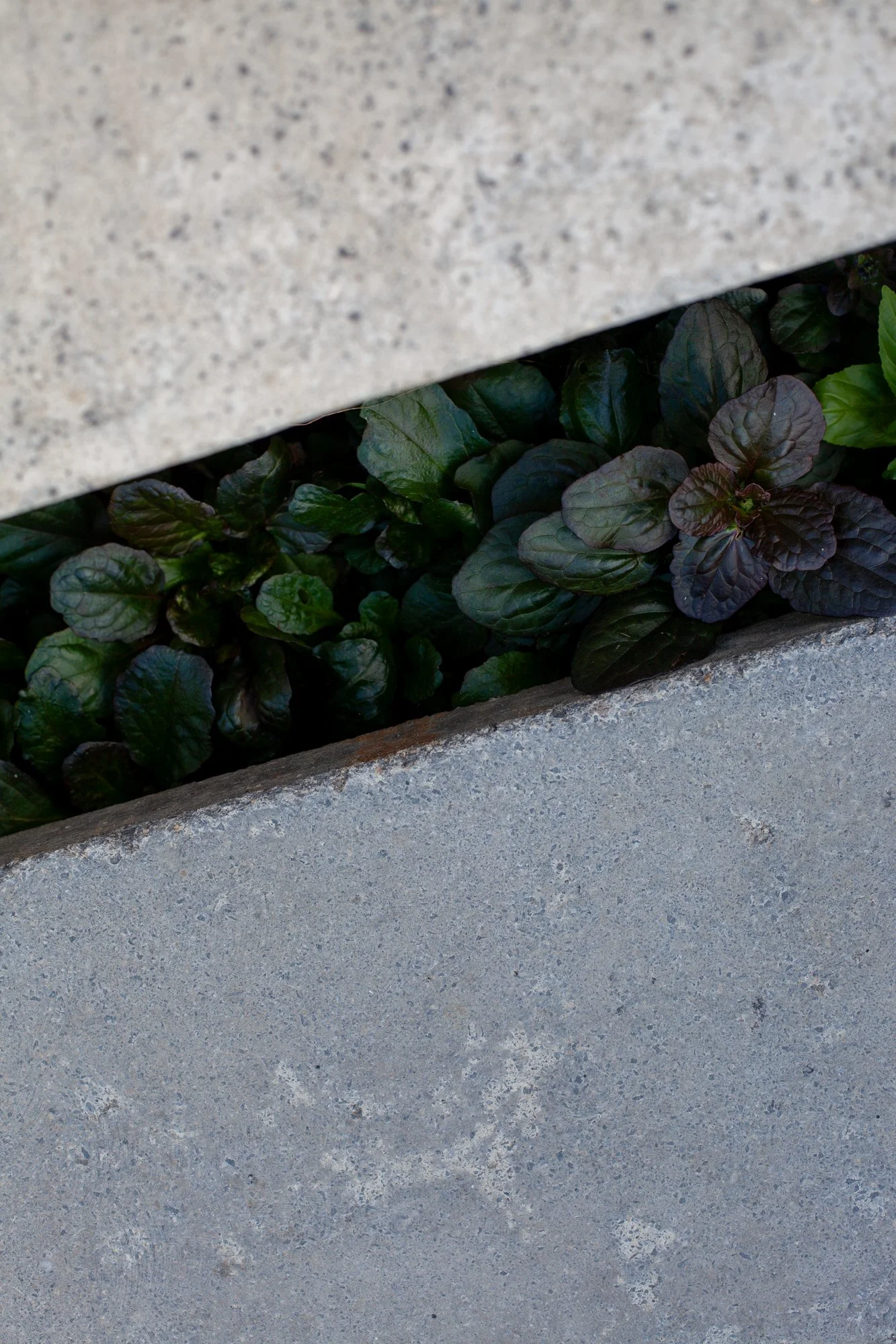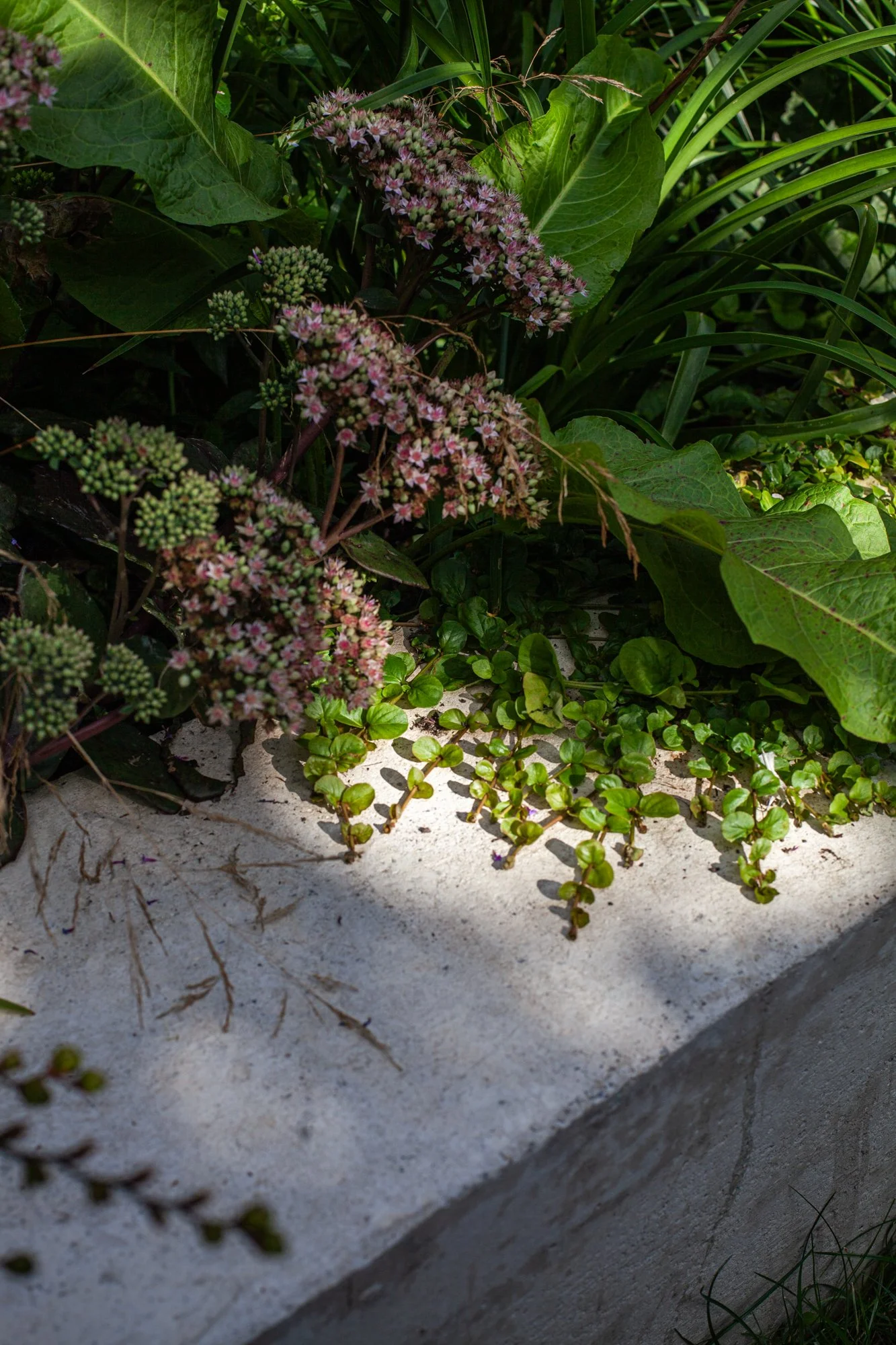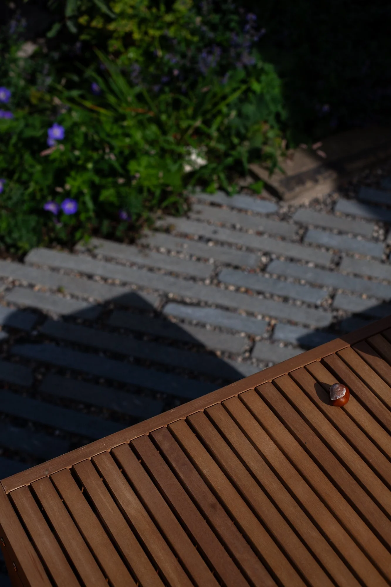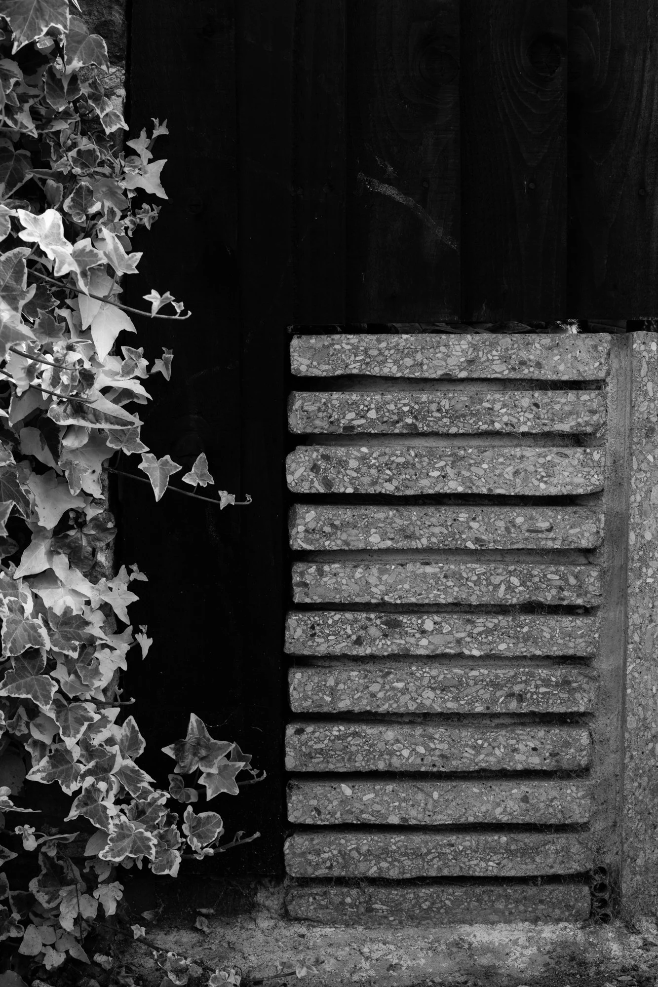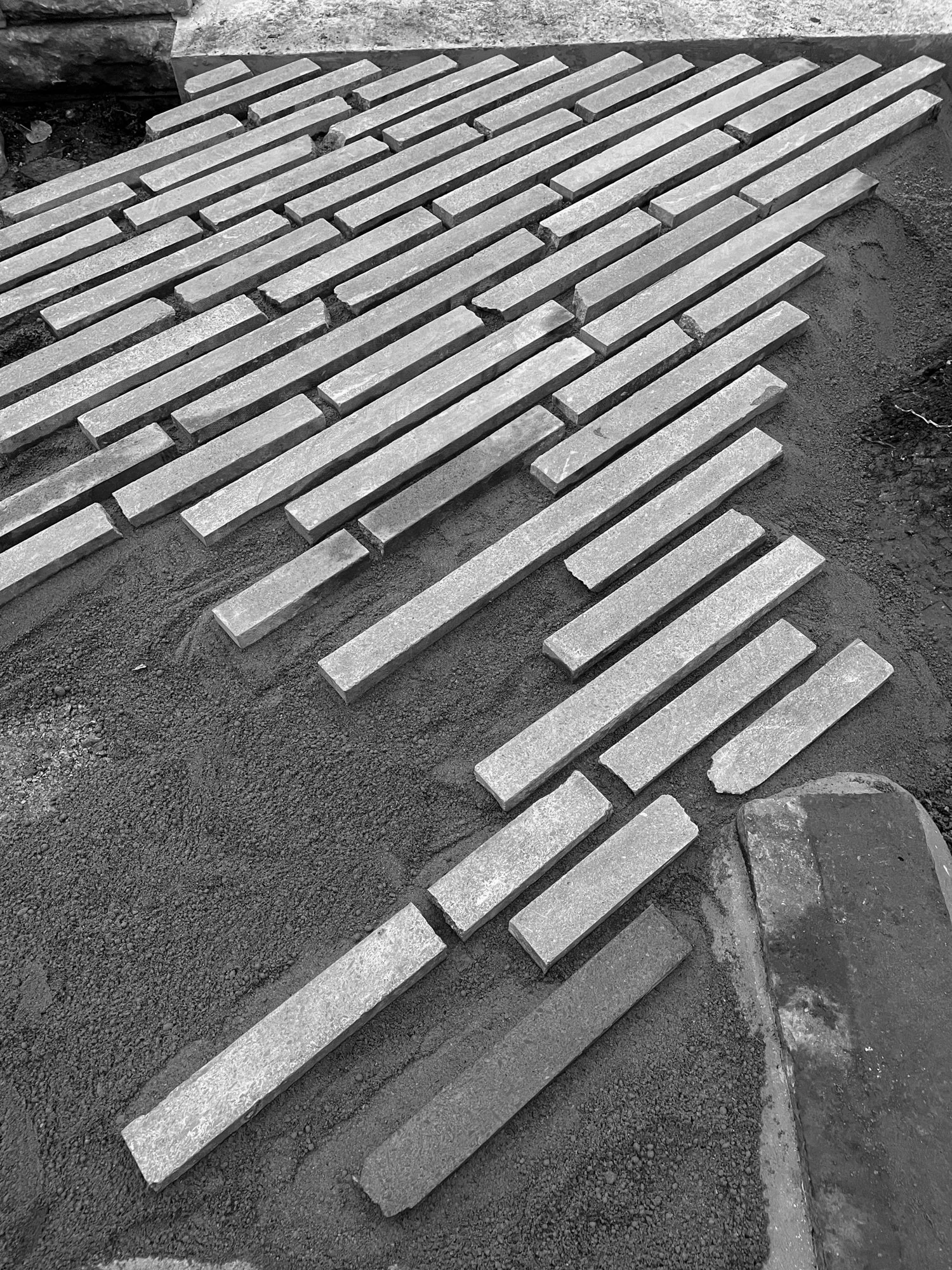 Unique slip paving and steps cut from concrete flooring slabs of previously demolished garage, custom formwork steps and retaining wall from eco-concrete, tied into old garage wall foundations and walls to prevent removal. Recycled aggregate gravels, reused existing paving cut to expose aggregate detail with recycled copper pipe weep holes for rear wall, re-orientation of yorkstone cathedral grade paving as stepping stones and widening of sandstone steps by the house and field stone boundary edging all made from stone found on site.