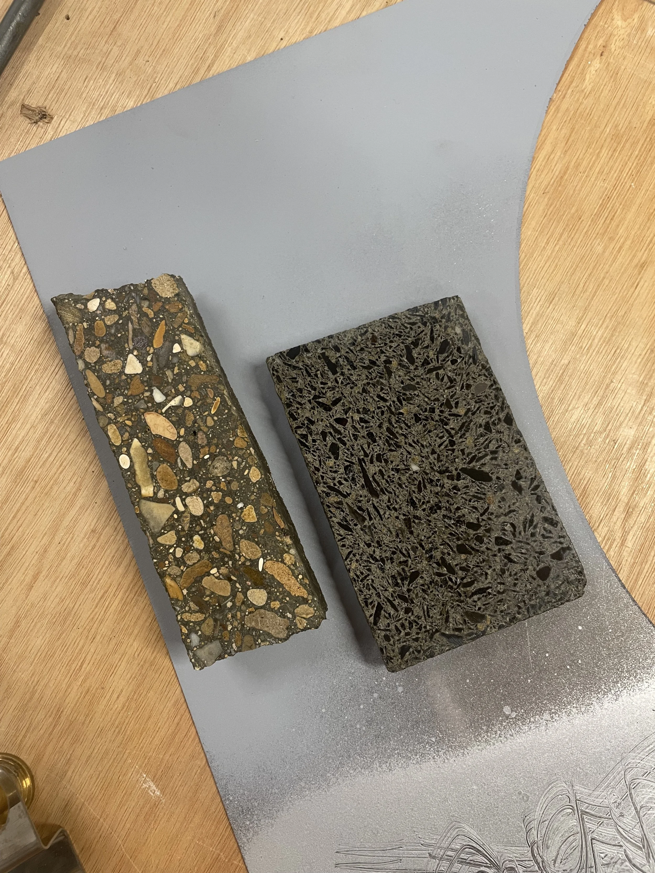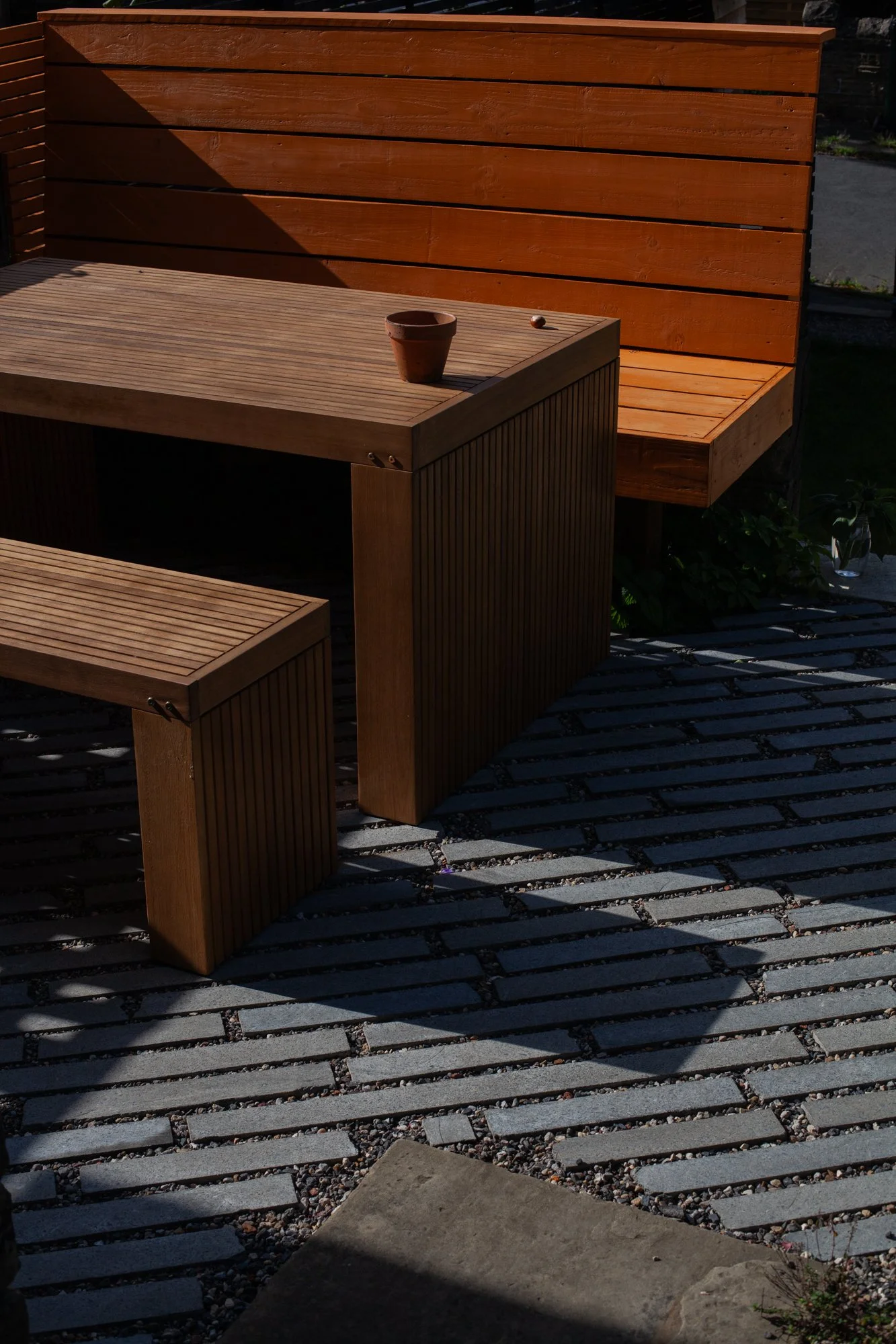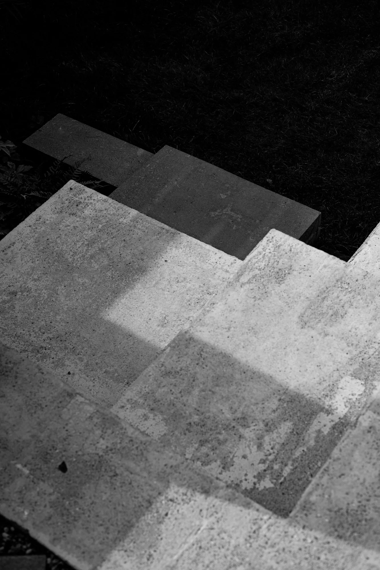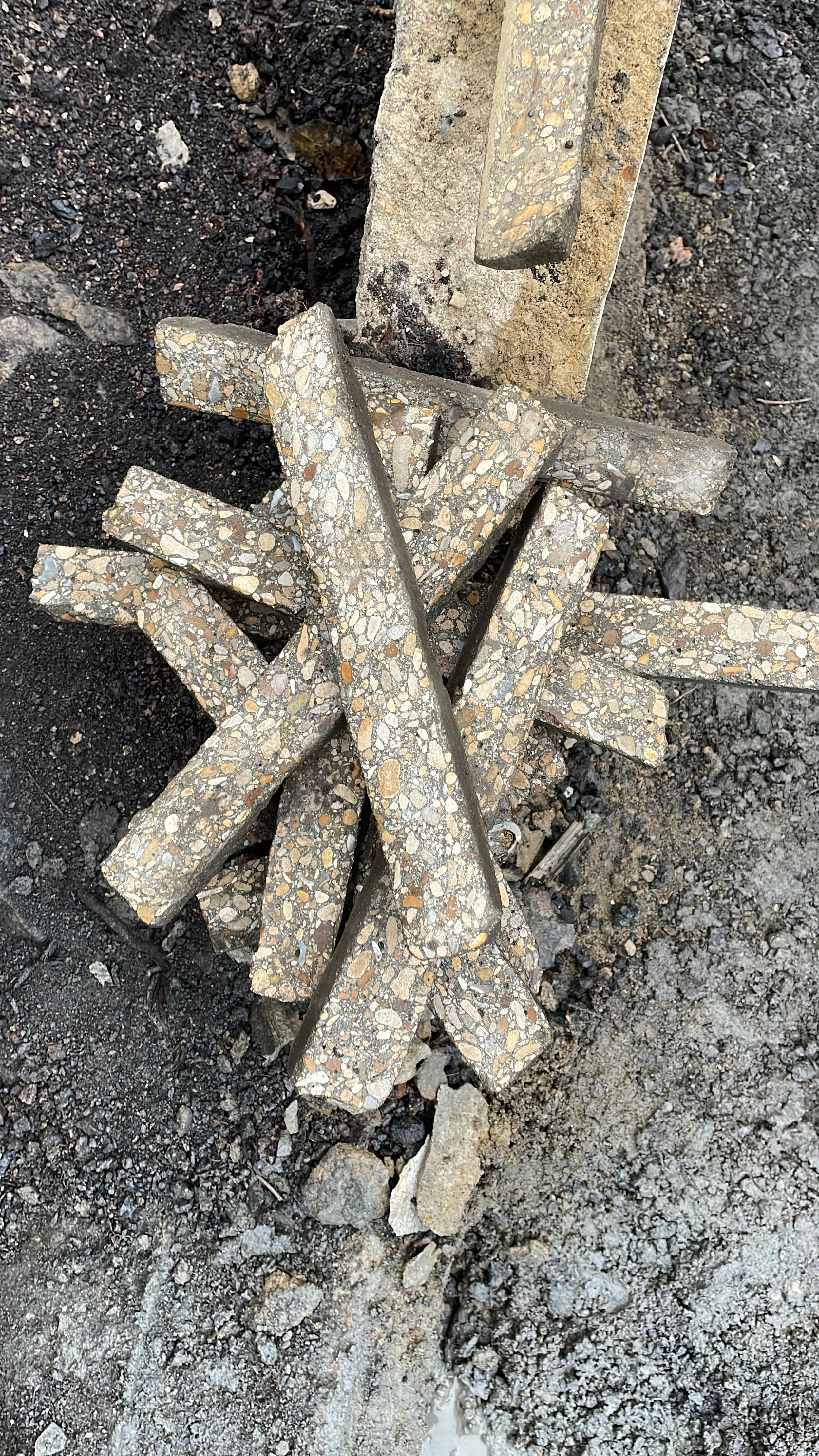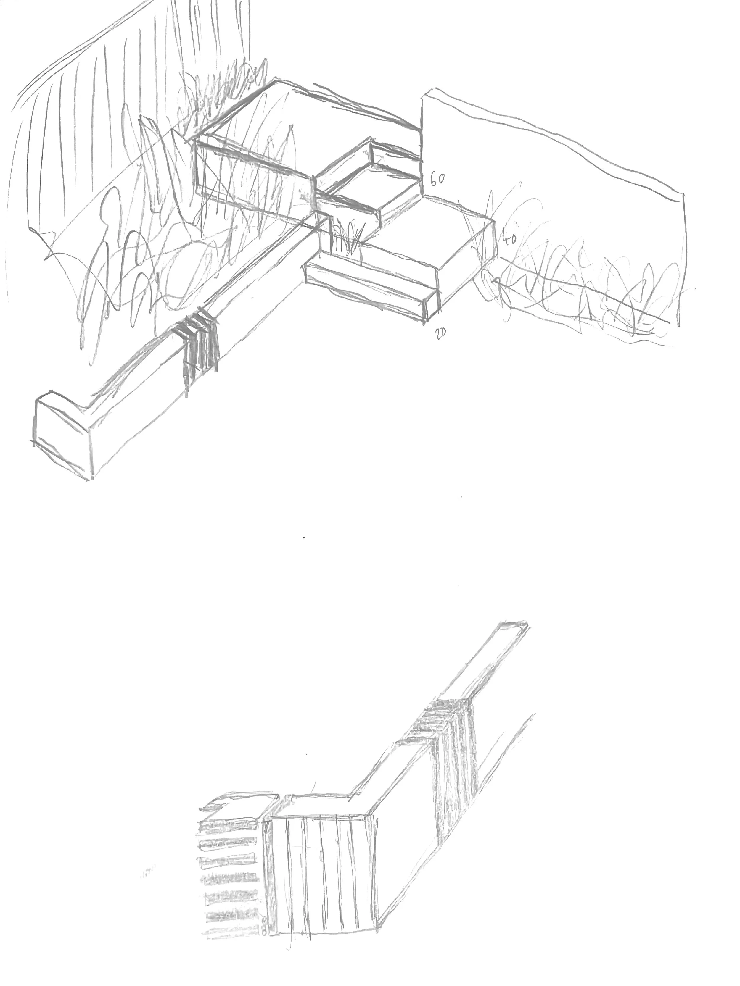 Unique slip paving and steps cut from concrete flooring slabs of previously demolished garage, custom formwork steps and retaining wall from eco-concrete, tied into old garage wall foundations and walls to prevent removal. Recycled aggregate gravels, reused existing paving cut to expose aggregate detail with recycled copper pipe weep holes for rear wall, re-orientation of yorkstone cathedral grade paving as stepping stones and widening of sandstone steps by the house and field stone boundary edging all made from stone found on site.