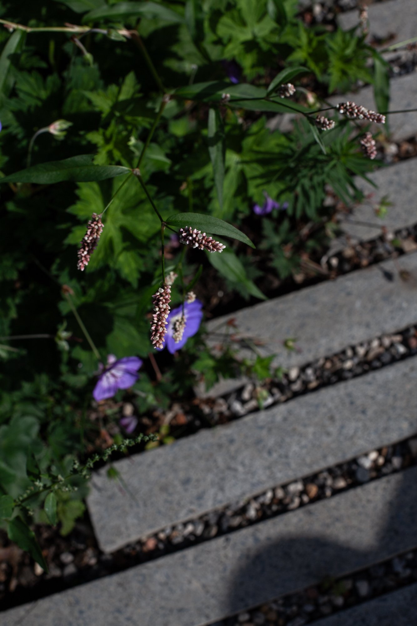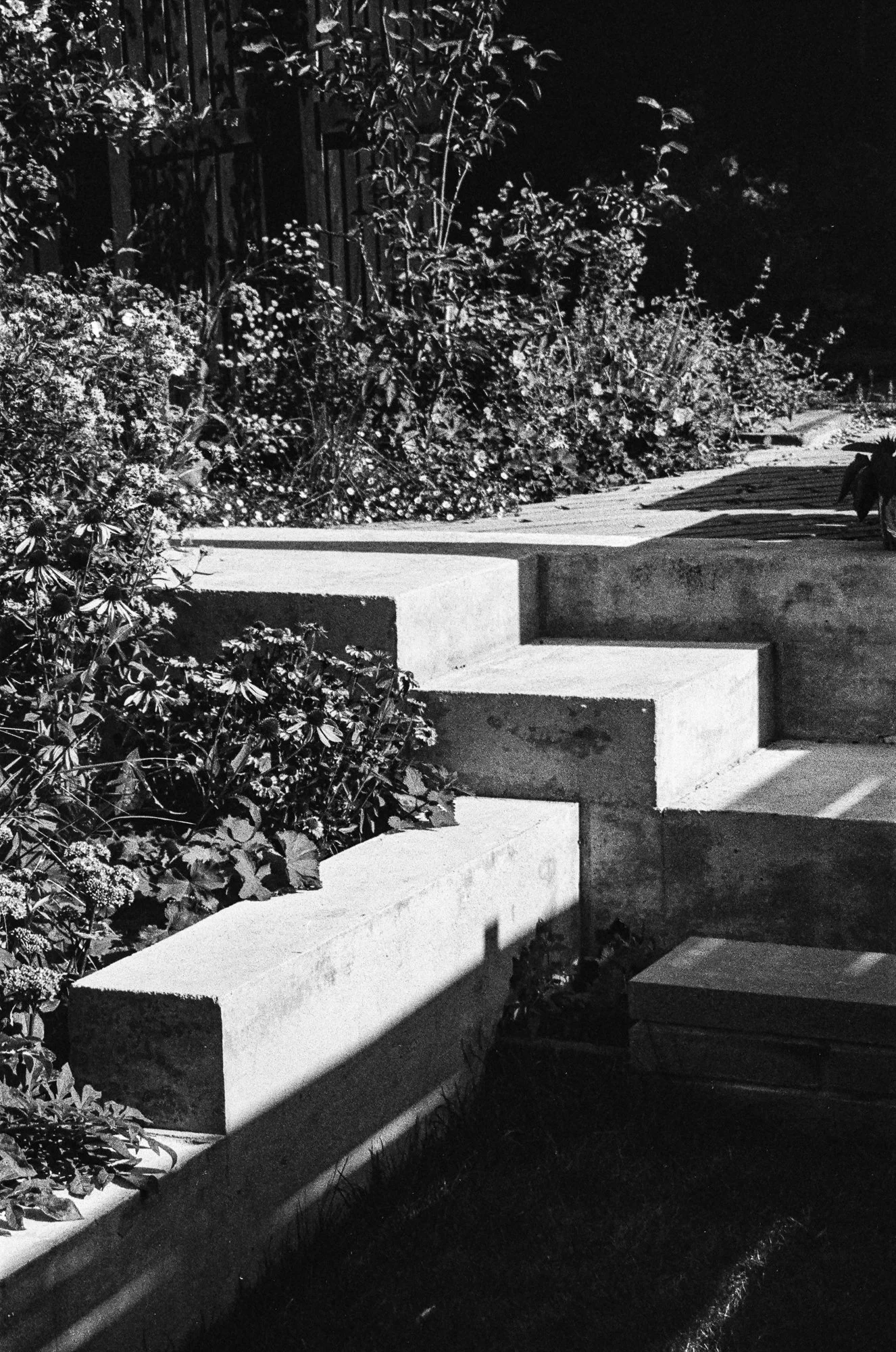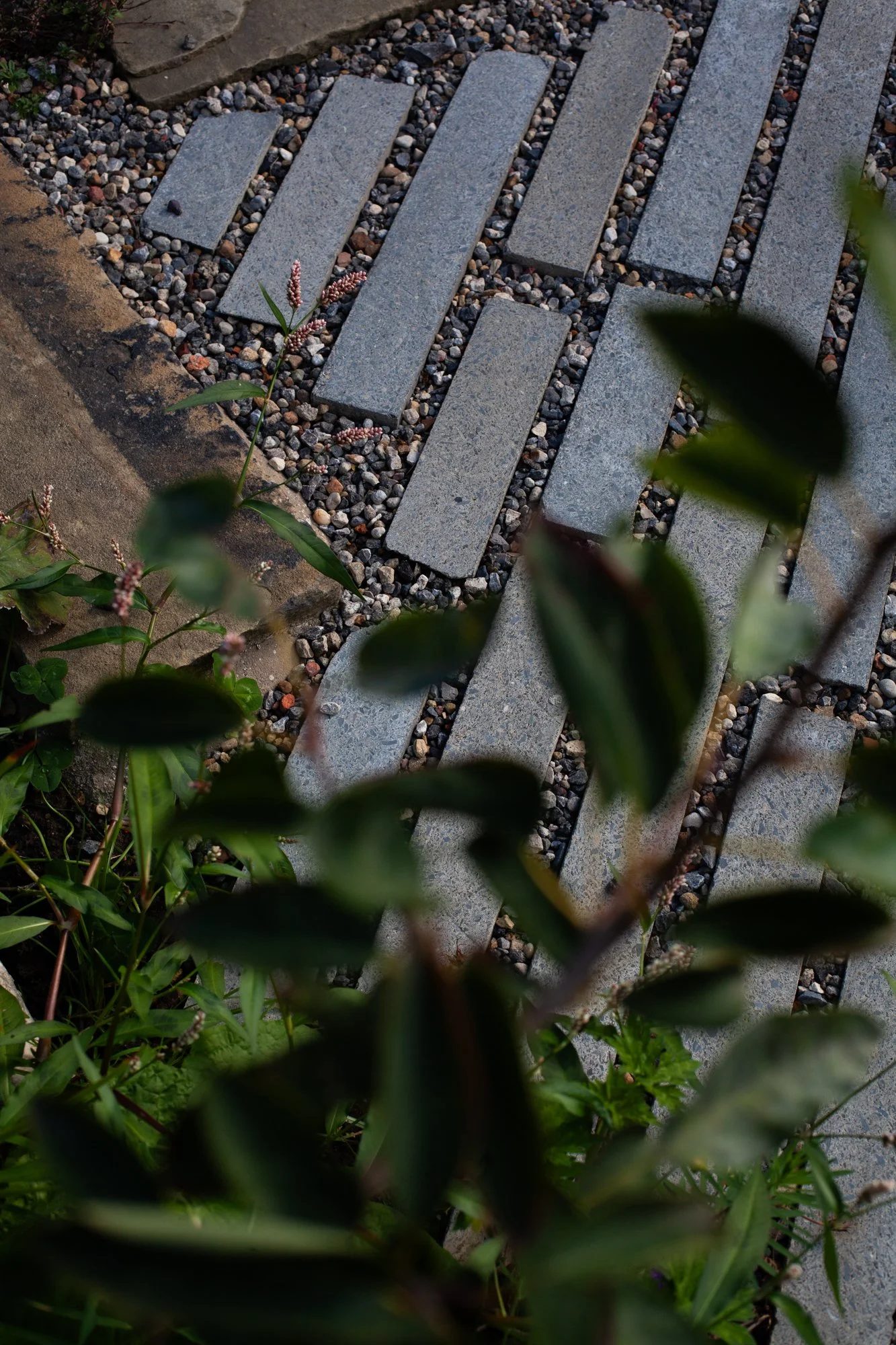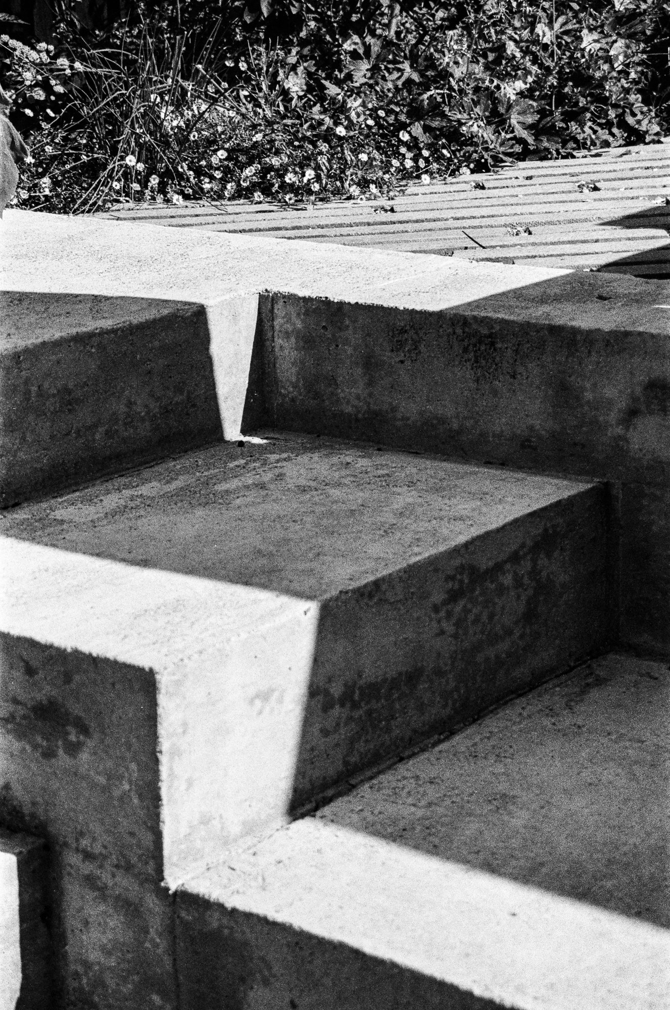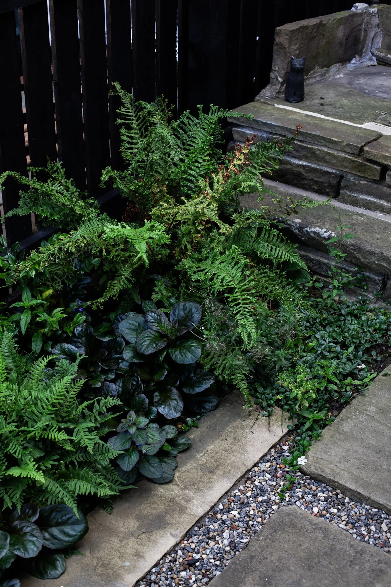 The new steps and retaining wall made from eco-concrete were tied into the former garage wall and foundations for stability and to prevent their removal. It created a different route through the space, a larger area to retain excavated soils and new dedicated planting zones. A wider step down from the house to stepping stones made from cathedral grace sandstone slabs found on site with recycled gravel infill meander through shaded planting to a raised dining and seating area that captures the most sunlight. Other concrete paving slabs found on site were cut open to reveal different aggregates and used as details in the rear section of the retaining wall complete with weep holes made from found copper piping. A floating underplanted bench and new fencing to the sides and rear with field stone boundary edging at the base made from stones unearthed on site completes the structural elements of the project.