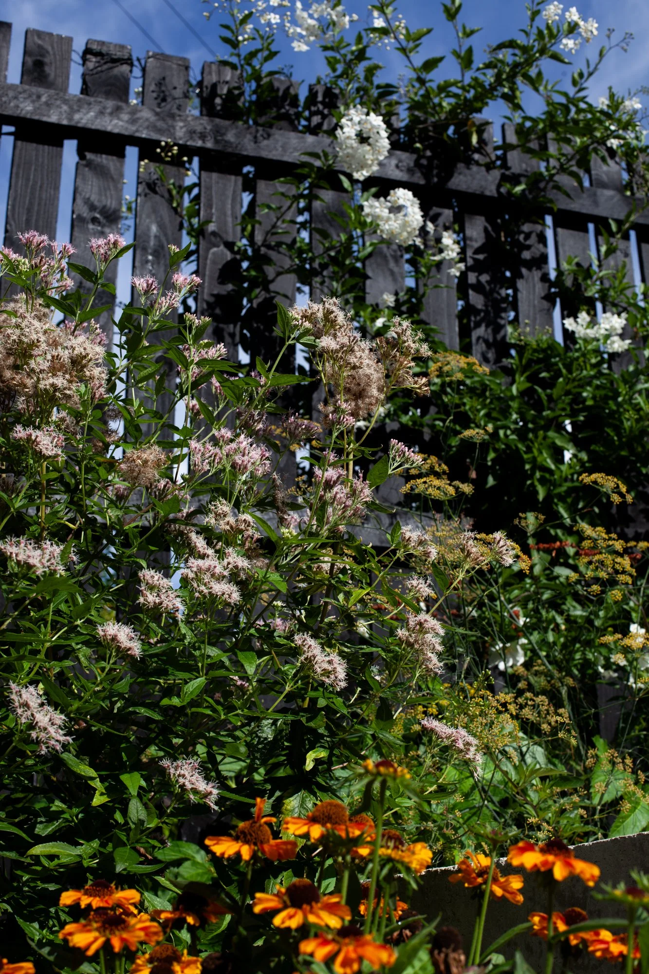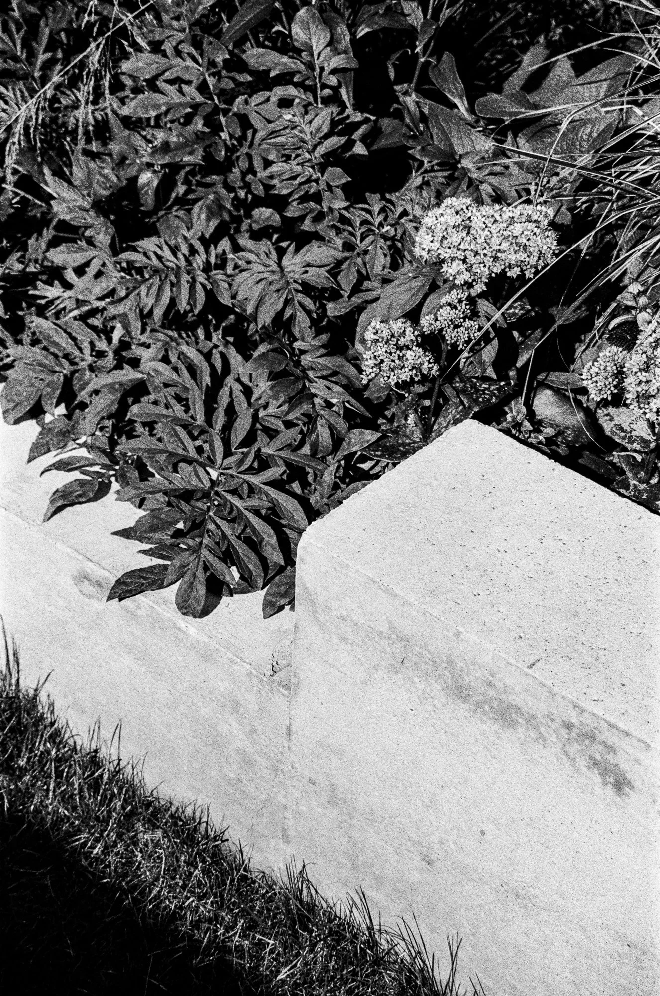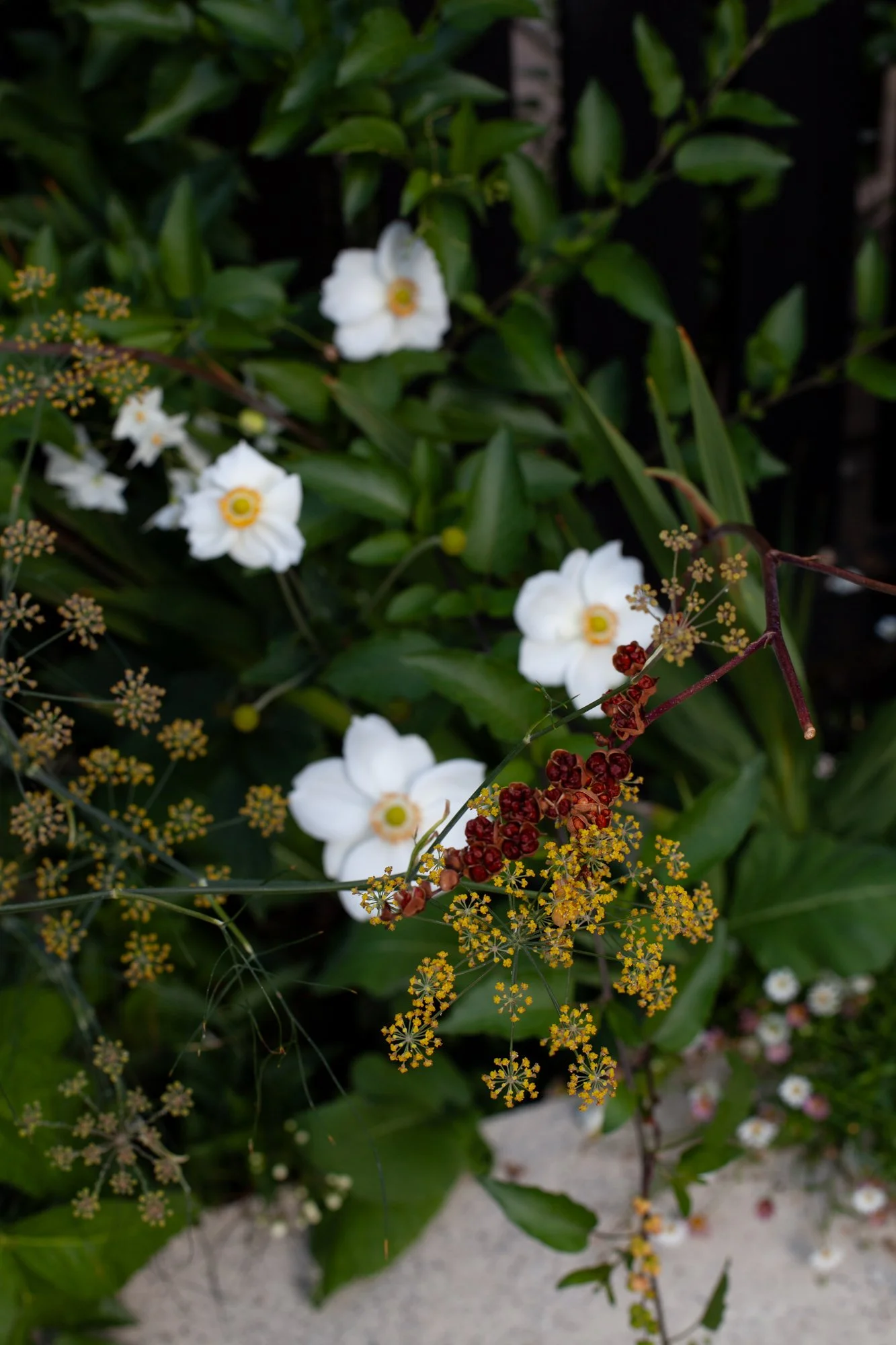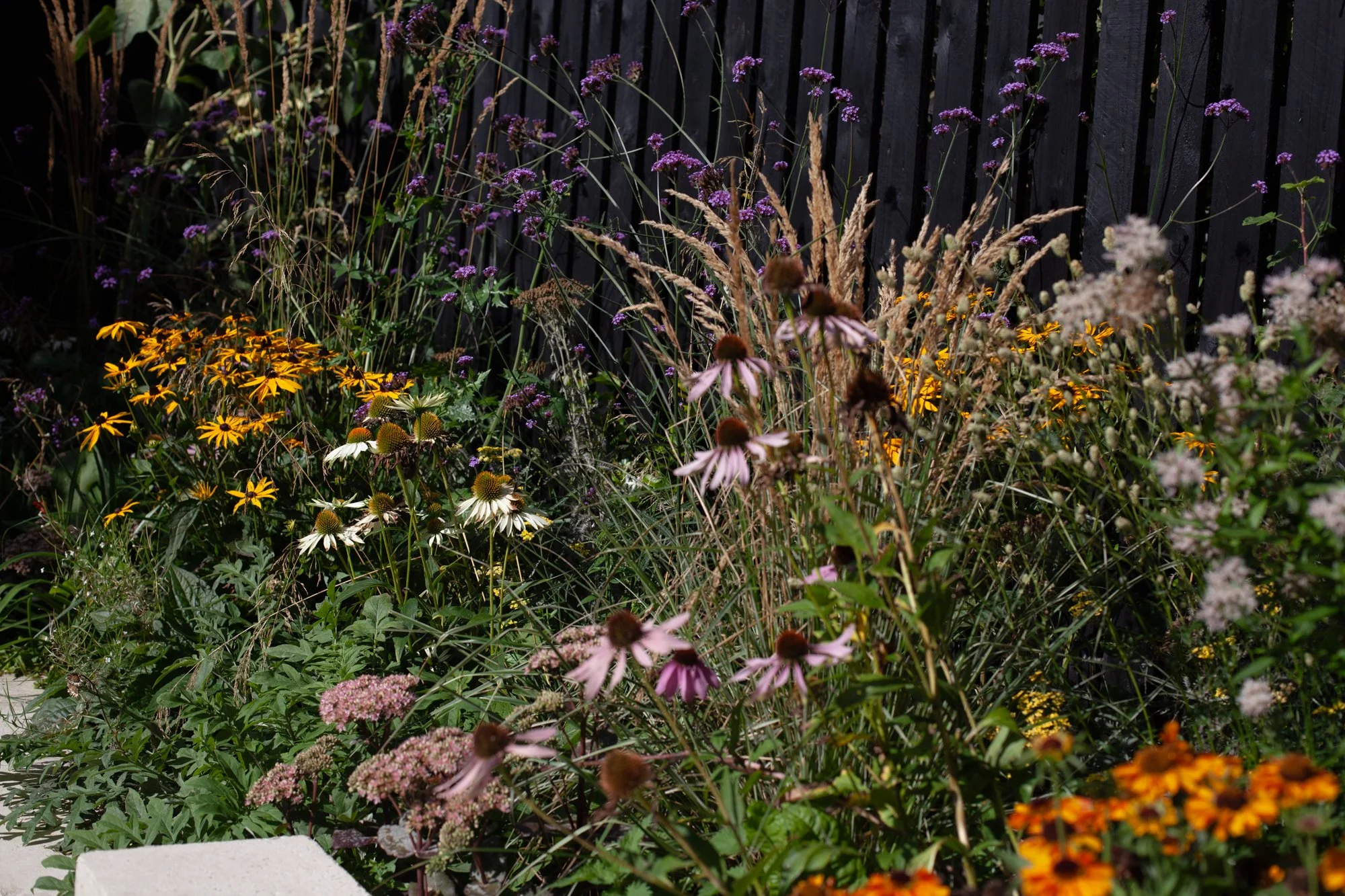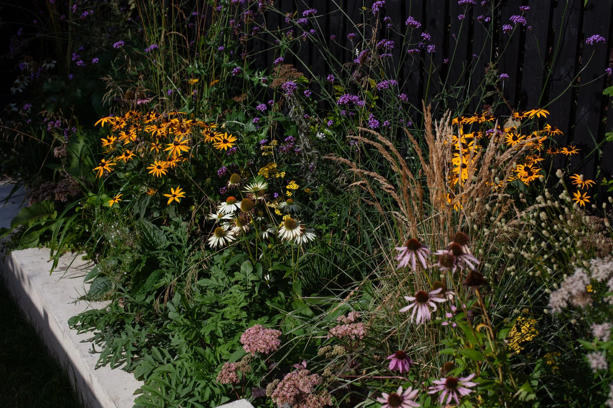 The new steps and retaining wall made from eco-concrete were tied into the former garage wall and foundations for stability and to prevent their removal. It created a different route through the space, a larger area to retain excavated soils and new dedicated planting zones. A wider step down from the house to stepping stones made from cathedral grace sandstone slabs found on site with recycled gravel infill meander through shaded planting to a raised dining and seating area that captures the most sunlight. Other concrete paving slabs found on site were cut open to reveal different aggregates and used as details in the rear section of the retaining wall complete with weep holes made from found copper piping. A floating underplanted bench and new fencing to the sides and rear with field stone boundary edging at the base made from stones unearthed on site completes the structural elements of the project.