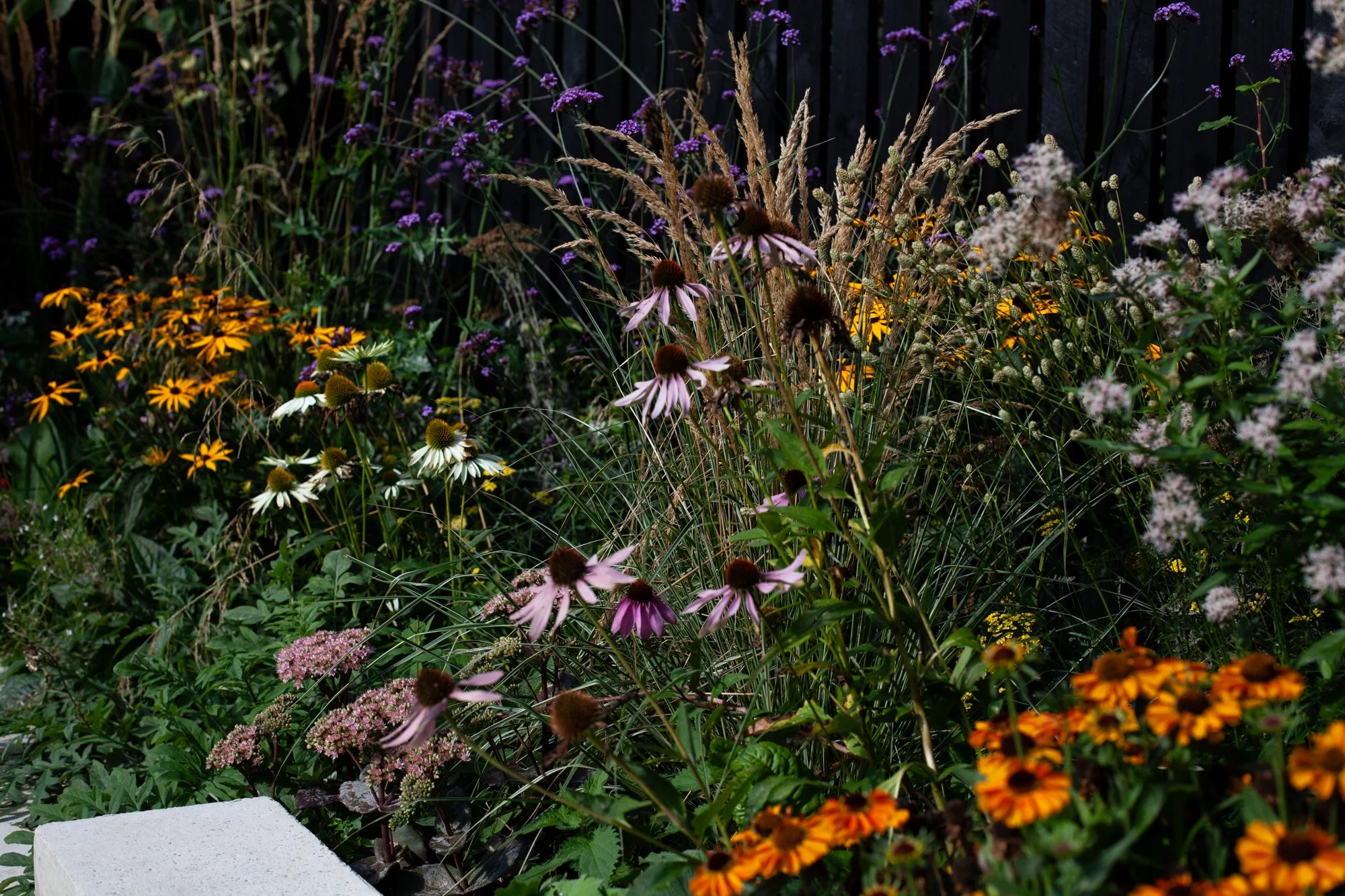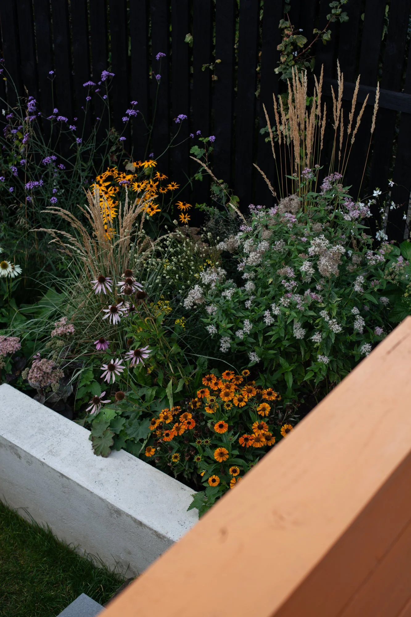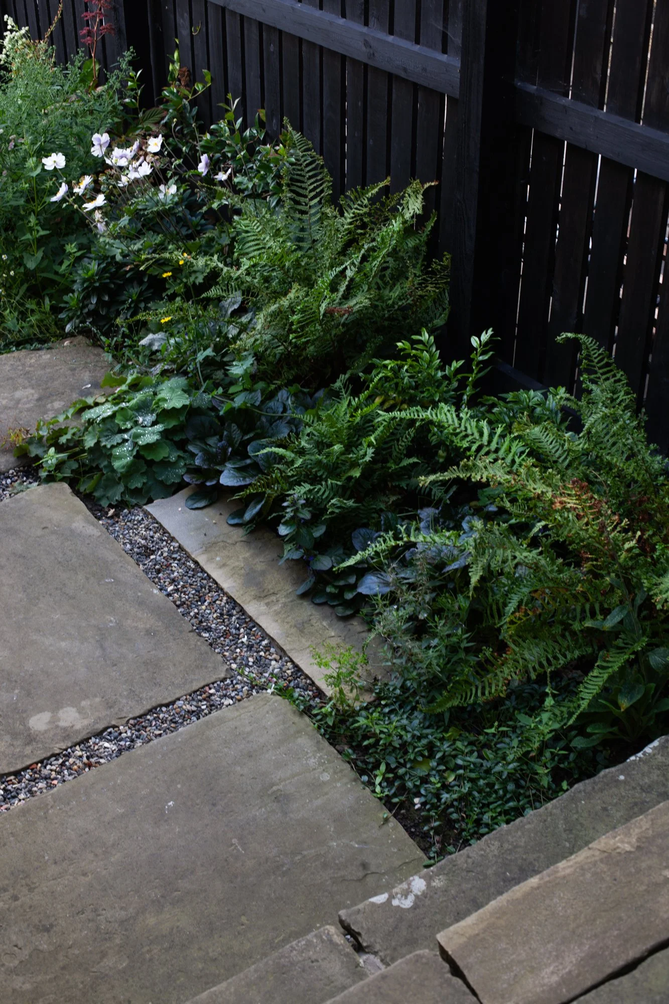 shade tolerant mixture of evergreen planting in deep shade areas with long border of grasses and flowering perennials and edible plants mixed through, large area of grass as play area seeded with a clay shade mix, sarcococca, purple elder and canadian service berry on clay/clinker soil in a north facing aspect