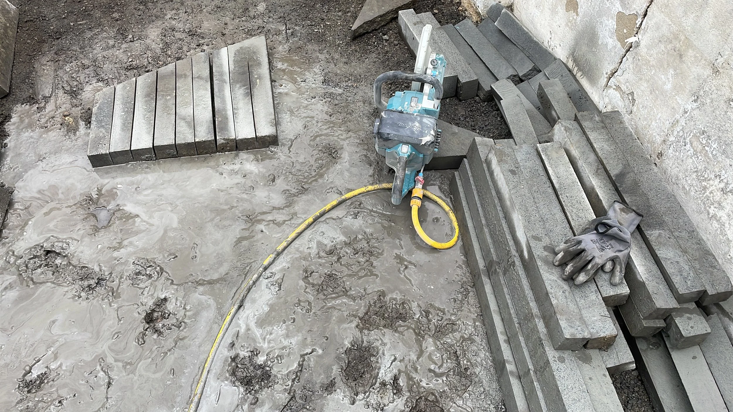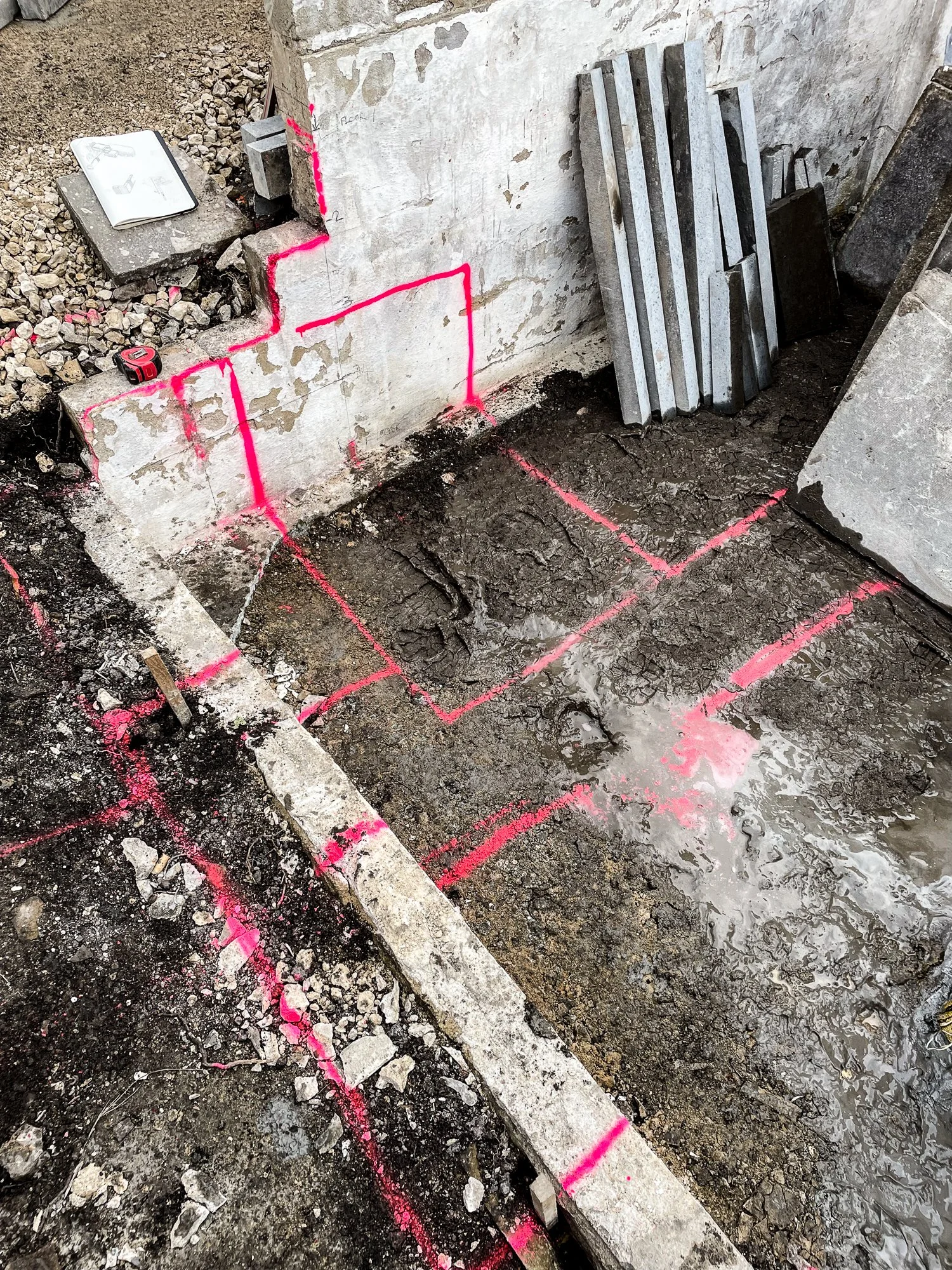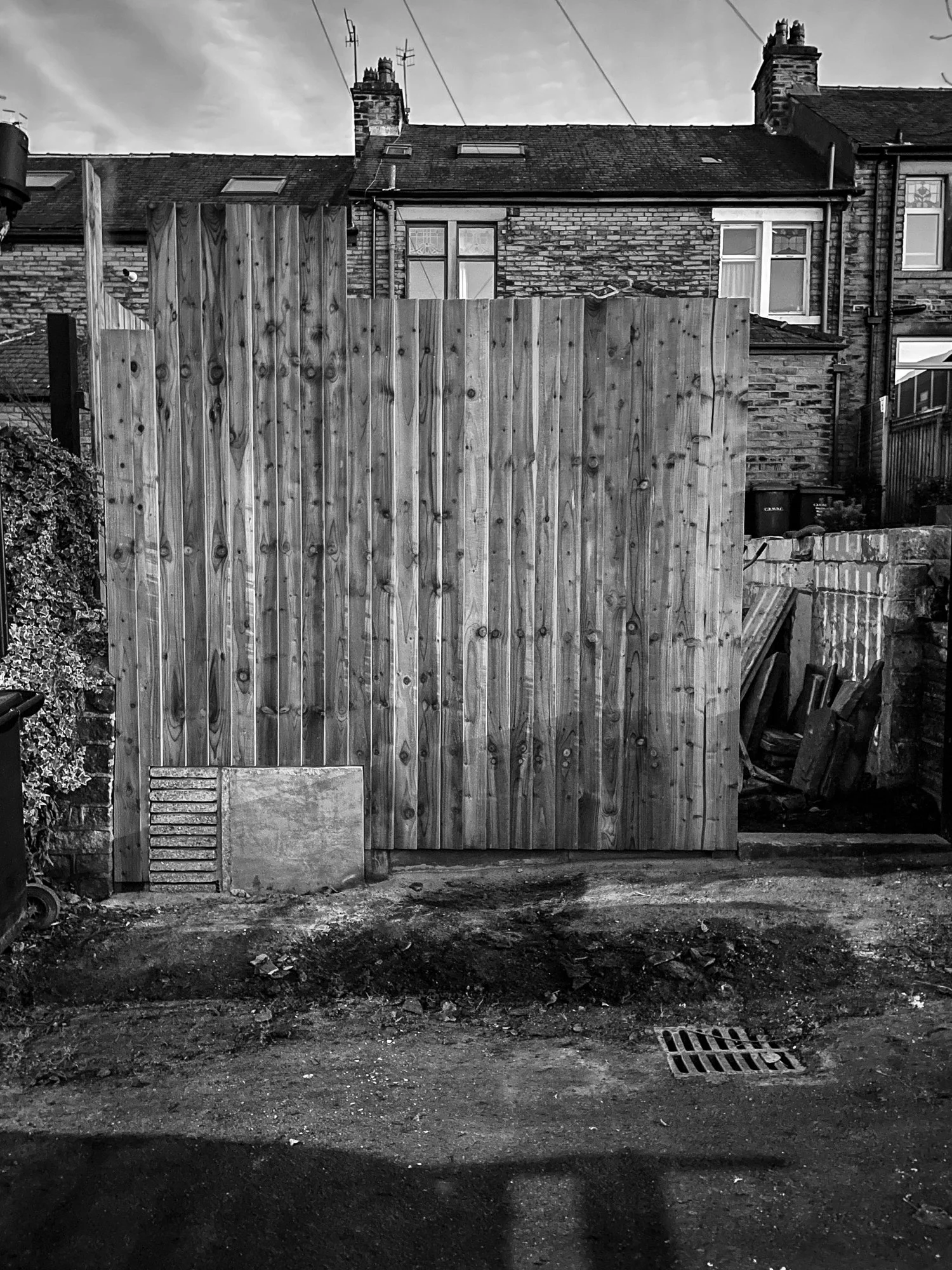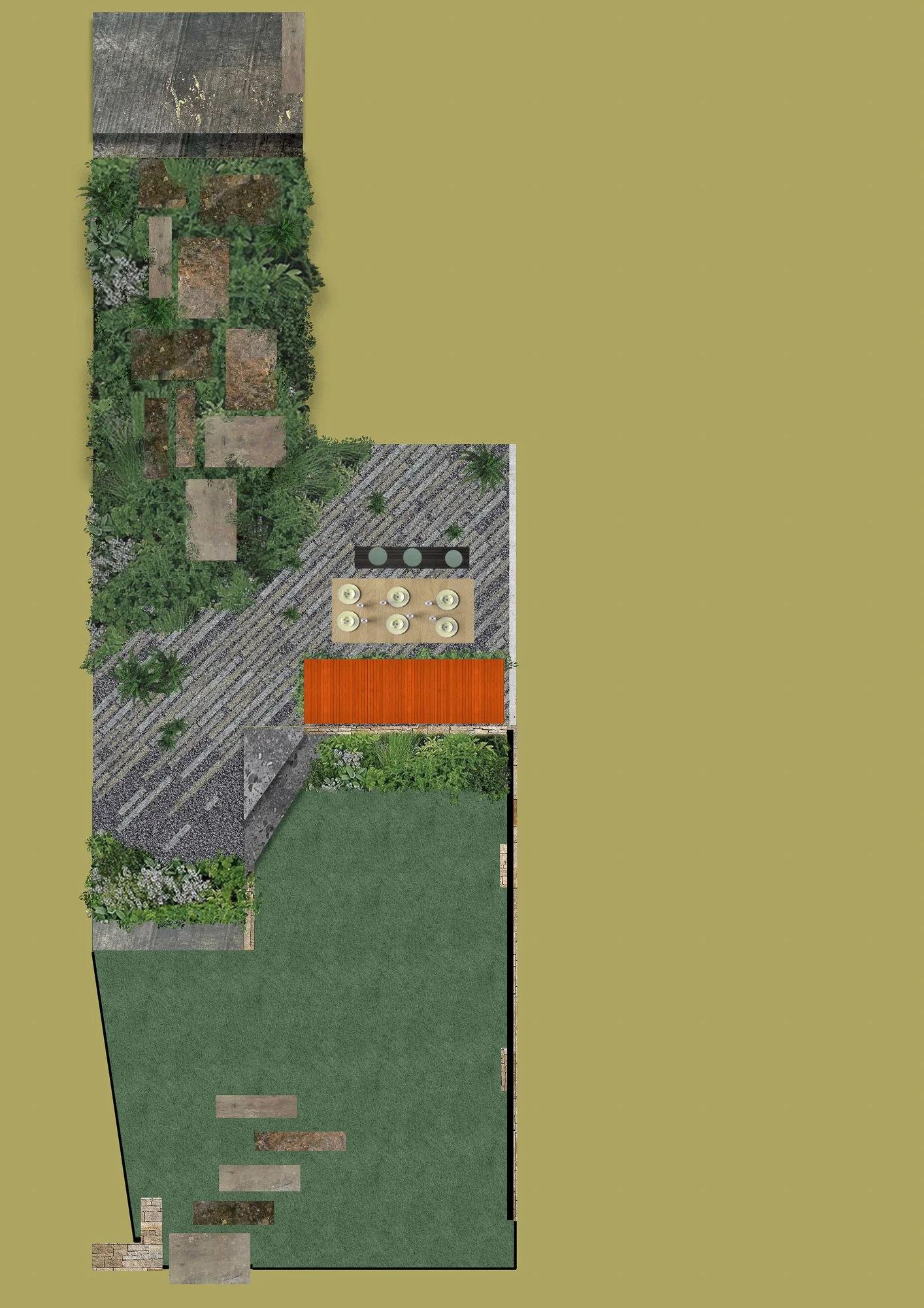 A partially demolished garage and unkept shrub boundary created a narrow straight path from the back door to the gate. Uneven surfaces of mixed natural and man made paving made the areas of hard standing impractical difficult to use. Tom and Becki wanted an area to dine outside and grass for their young son to play on as well as privacy from the access road at the rear and neighbours to the side where the garage once stood. Utilising materials already present on site was key to maximising the budget and minimising the environmental footprint of the build. Lifting the paving slabs from the former garage floor and cutting into strips to reveal the aggregate pattern inside allowed a unique hard standing area to be created.