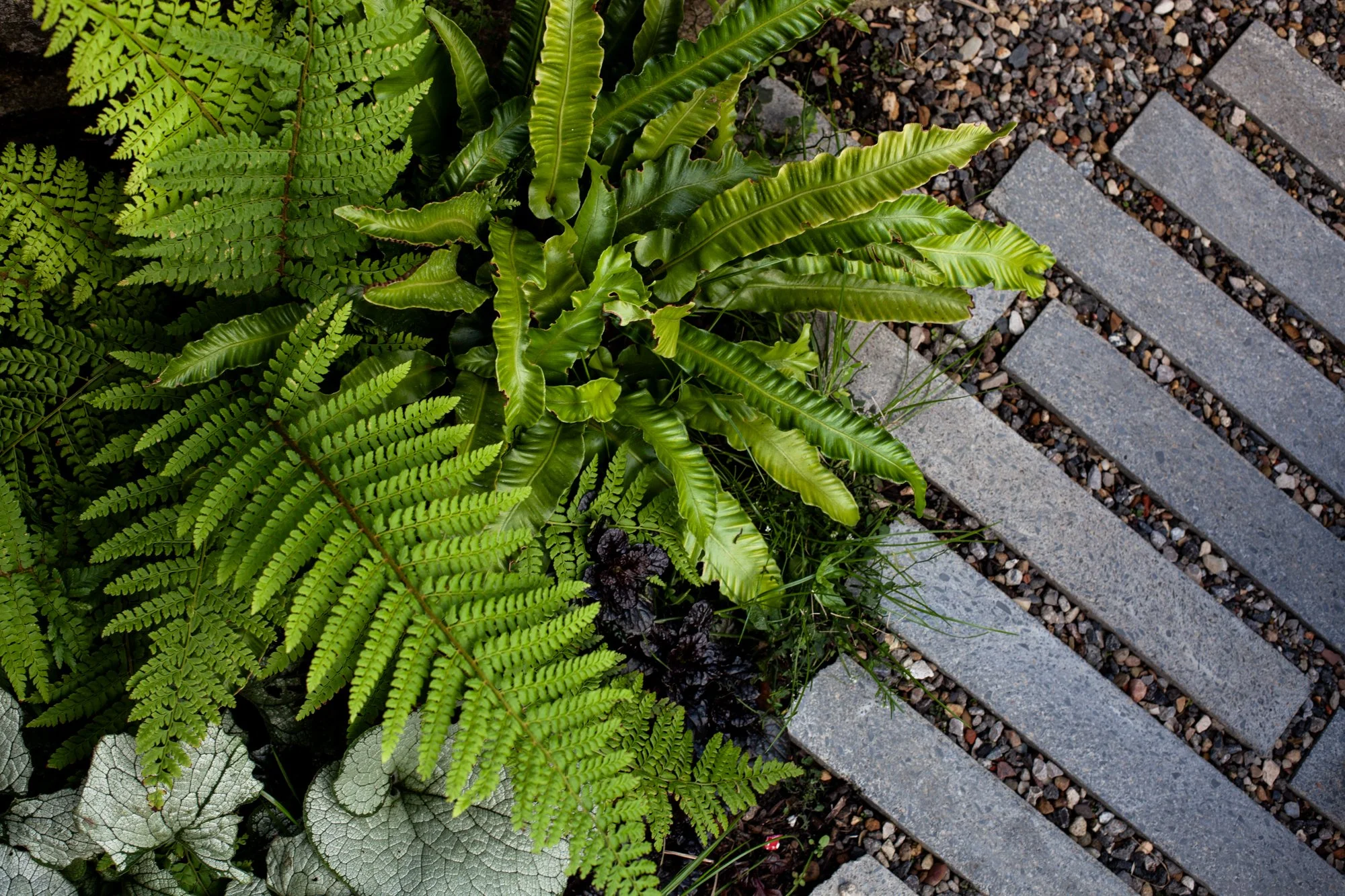 Shade tolerant mixture of ferns, perennials and winter flowering evergreen shrubs spread from the deep shade areas by the house, changing with increased sun exposure toward a multi-stem amalanchier opposite the new dining area. Flowering perennials, grasses and edible plants flow into the lower long border above a large grassed play area seeded with a clay shade mix.