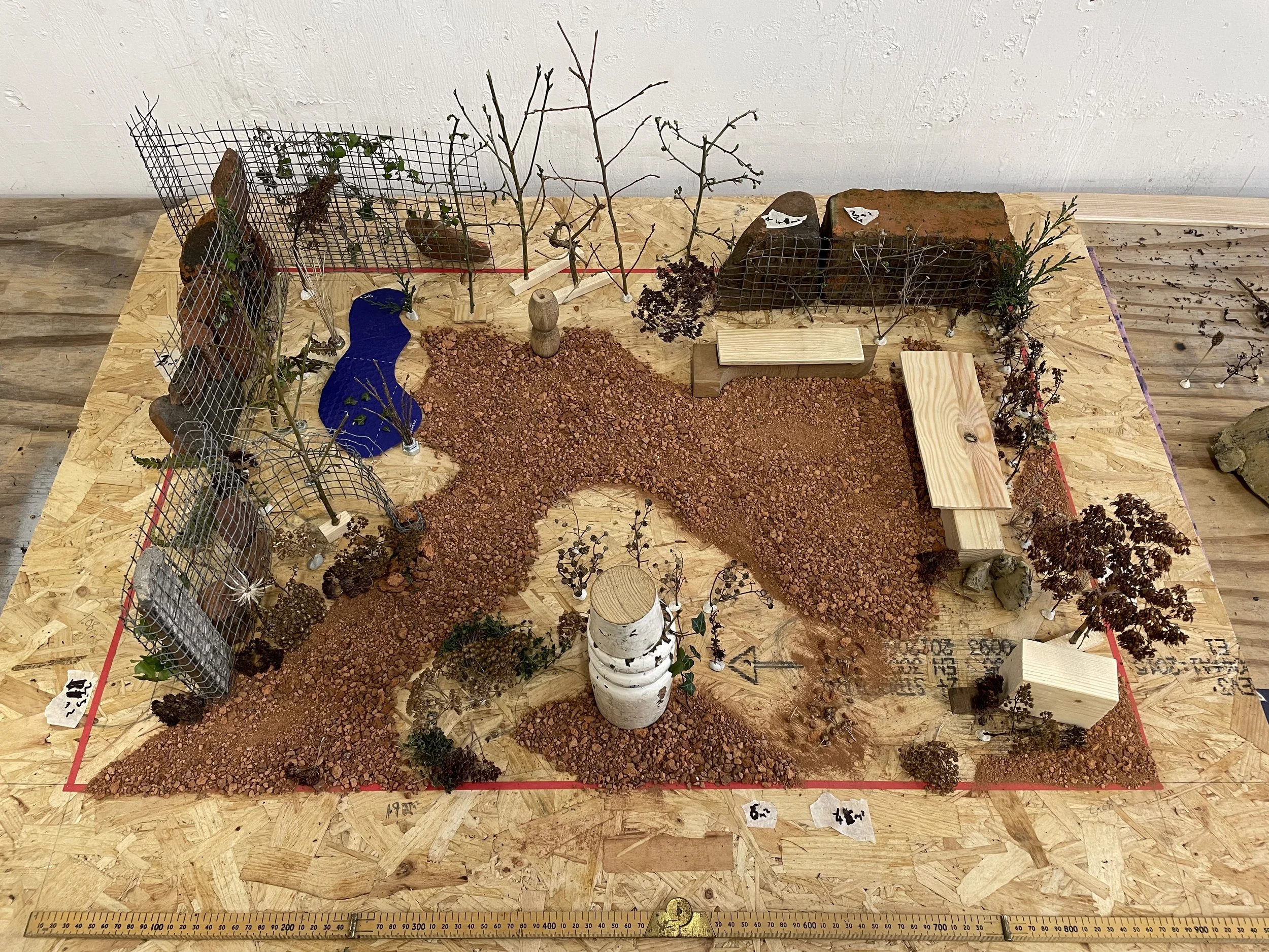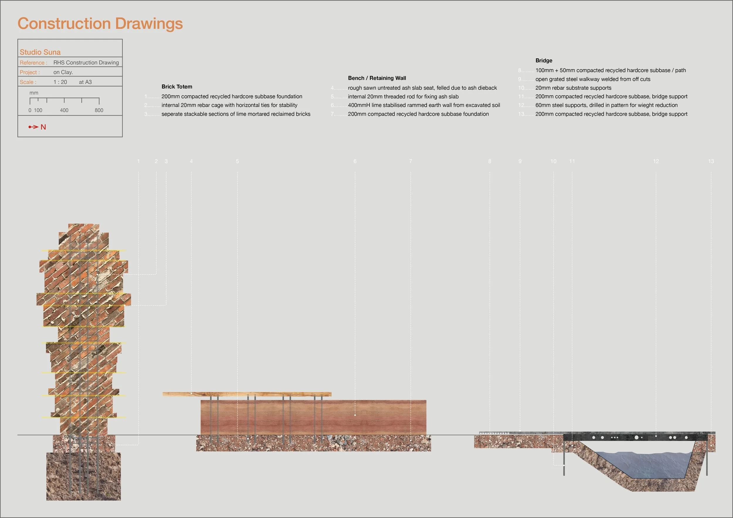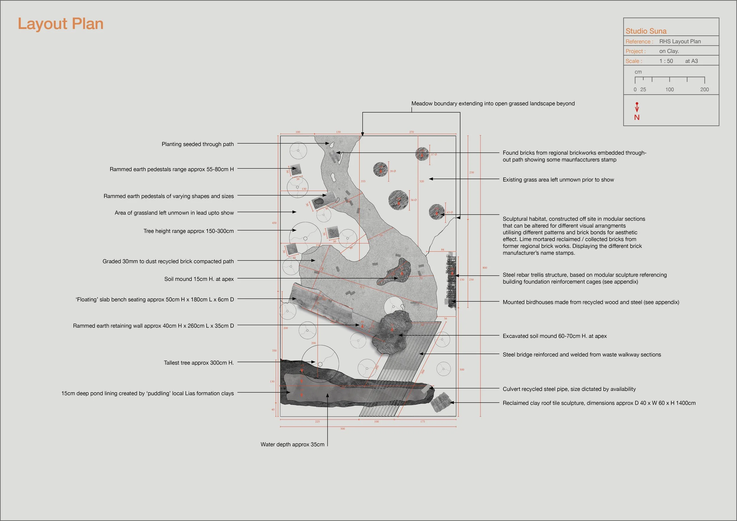 Reorientated design and boundary editions made from common building materials, waste brick and processed wild clay excavated on site during construction activities.