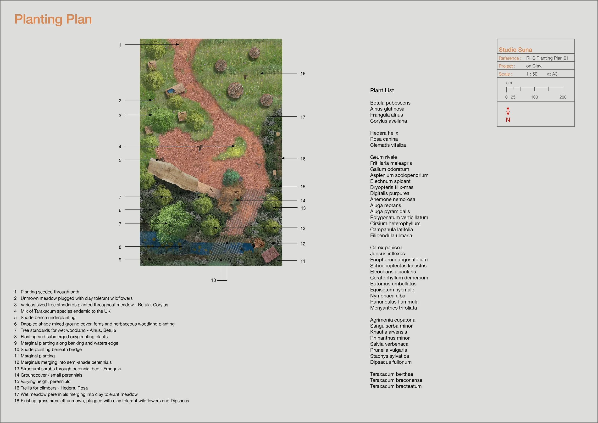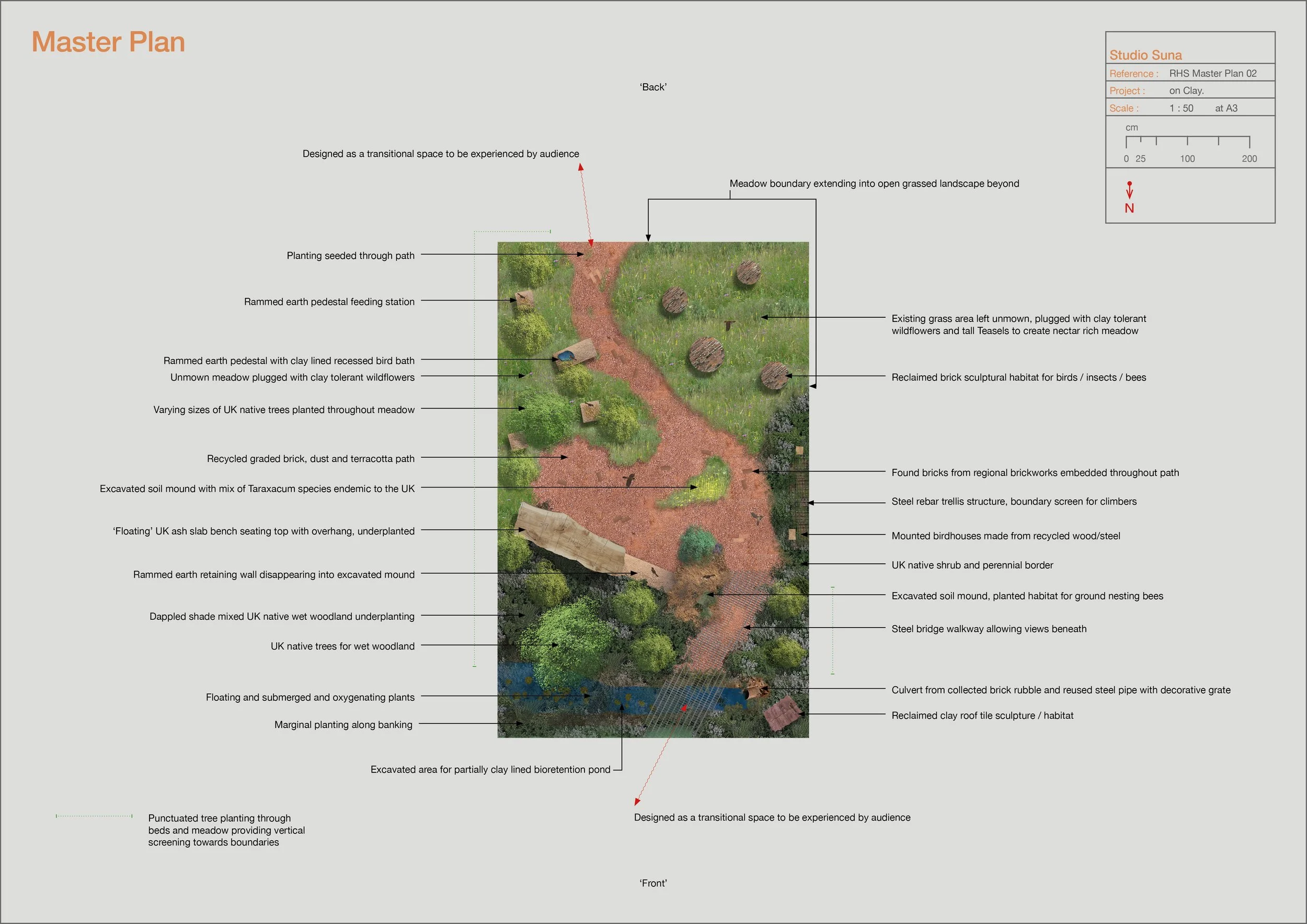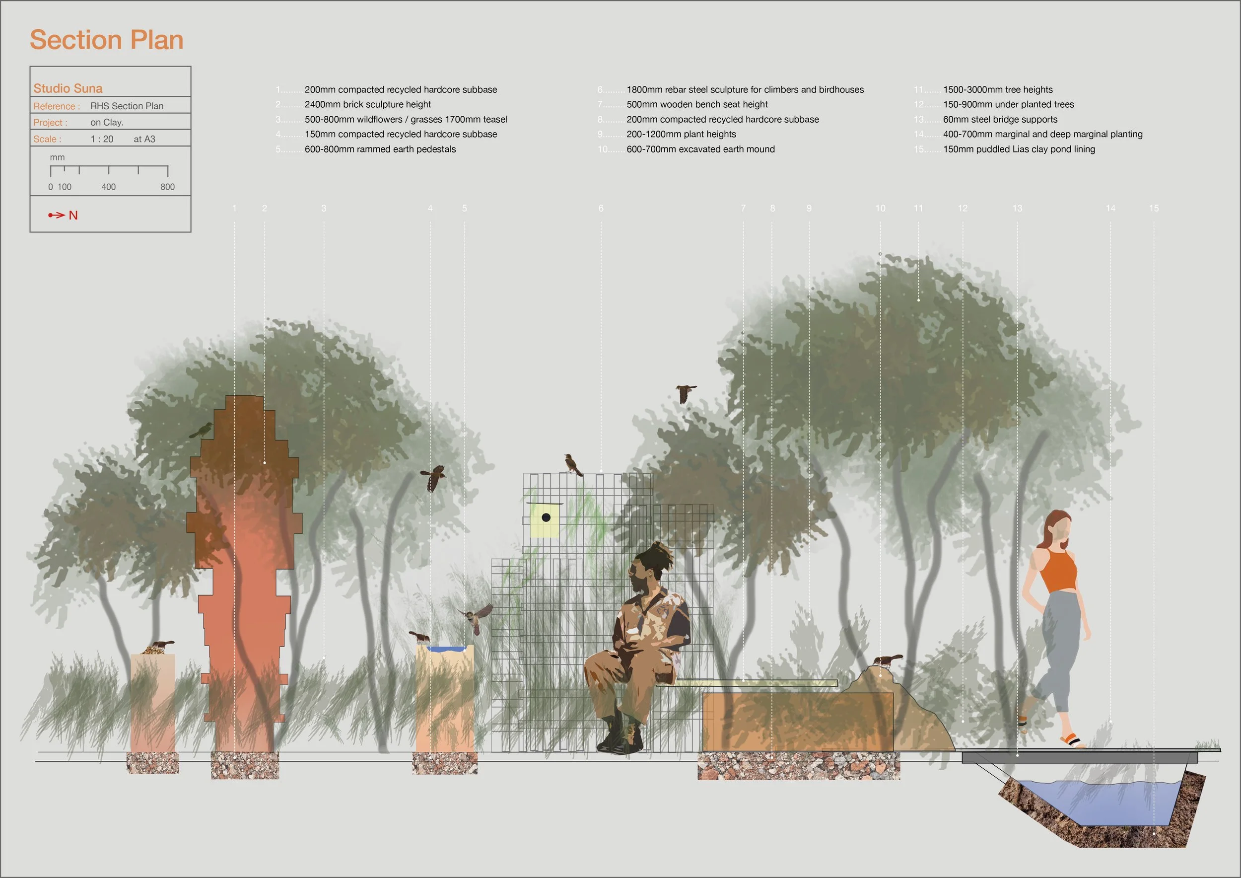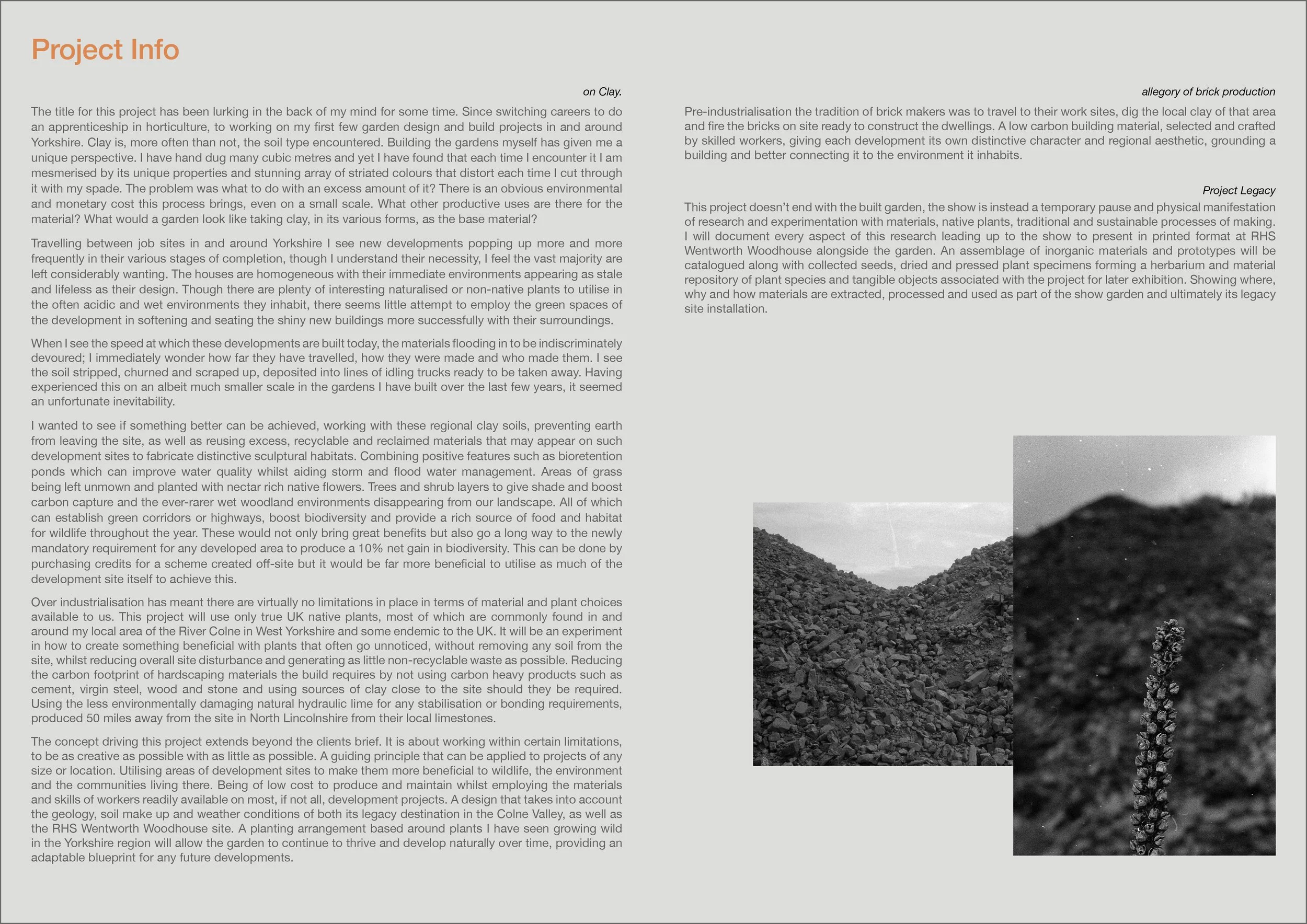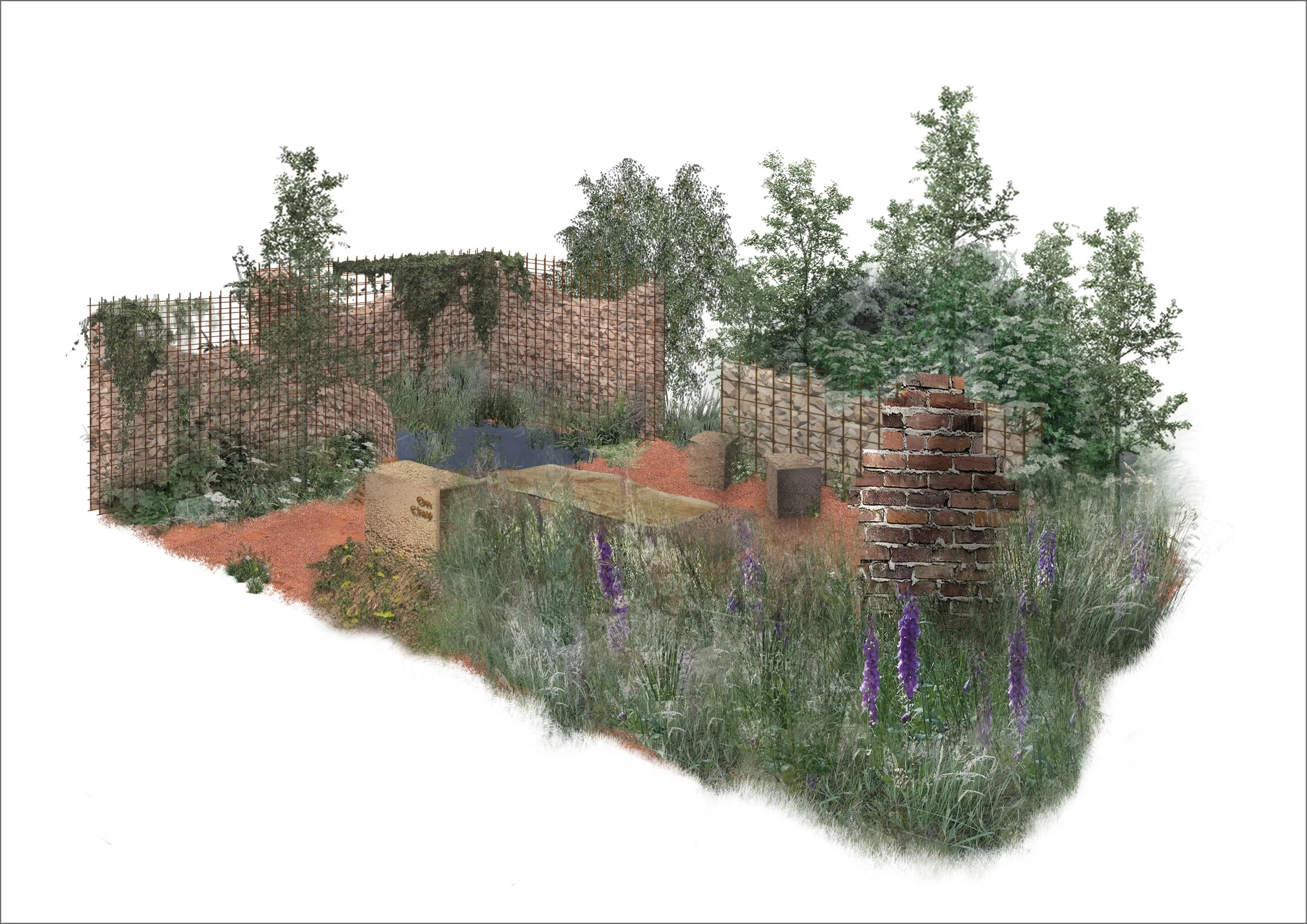 A show garden designed with only native planting that utilises localised clay soils and geology to create a space which prioritises the environment, ecology, habitat and re-use of materials for new property developments on brown field sites across Yorkshire and other similar geological and pedological sites in the UK.